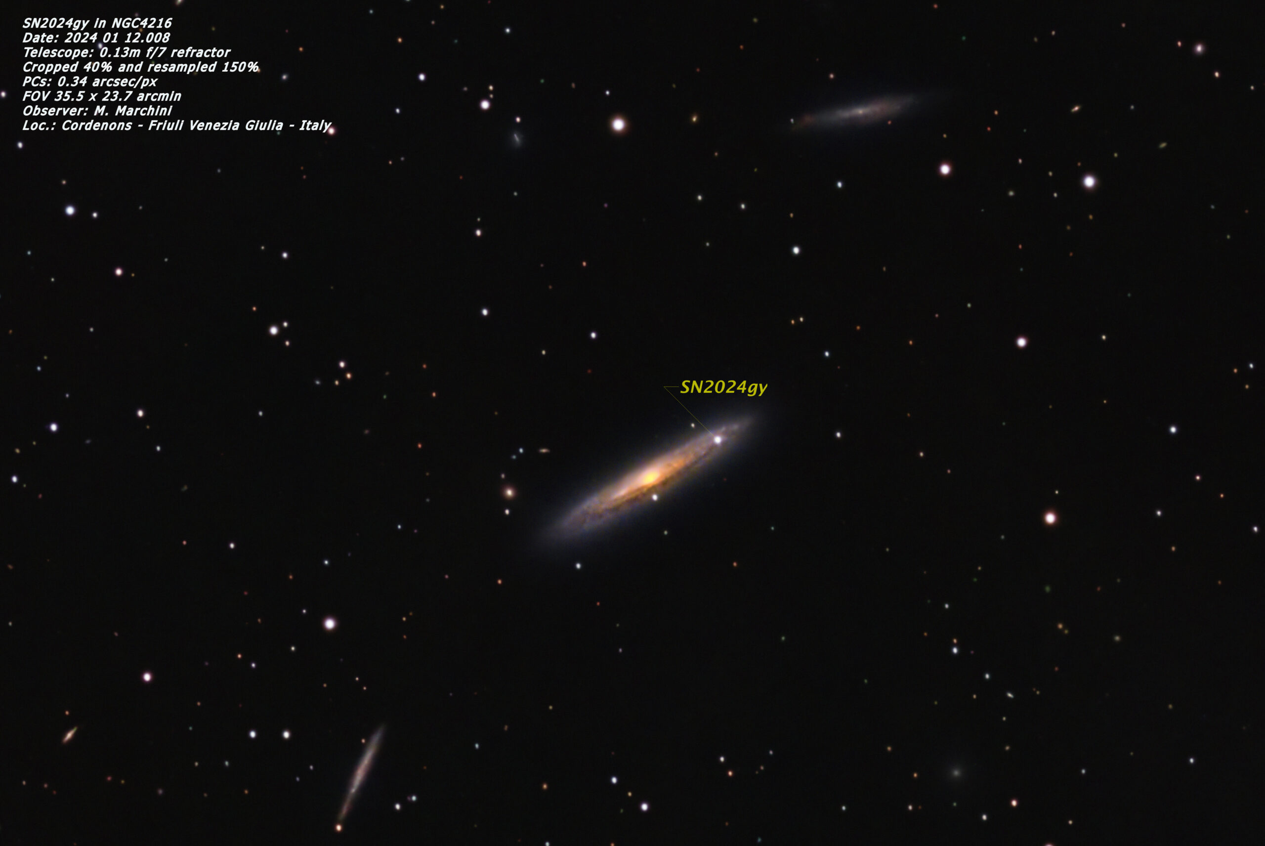 Quando hai notizia della scoperta di una Supernova, ti vien voglia di cercarla. Se, come nel mio caso, hai una postazione fissa, allora ti organizzi anche per fotografarla. Meglio se, come in questo caso, sai che puoi attendere qualche giorno per coglierla vicino alla sua massima luminosità. Questa prima immagine è stata comunque ripresa un po’ in fretta, con un telescopio non del tutto adatto per lunghezza focale, ma appare già bel definita nel braccio della Galazzia in cui è esplosa (NGC4216).