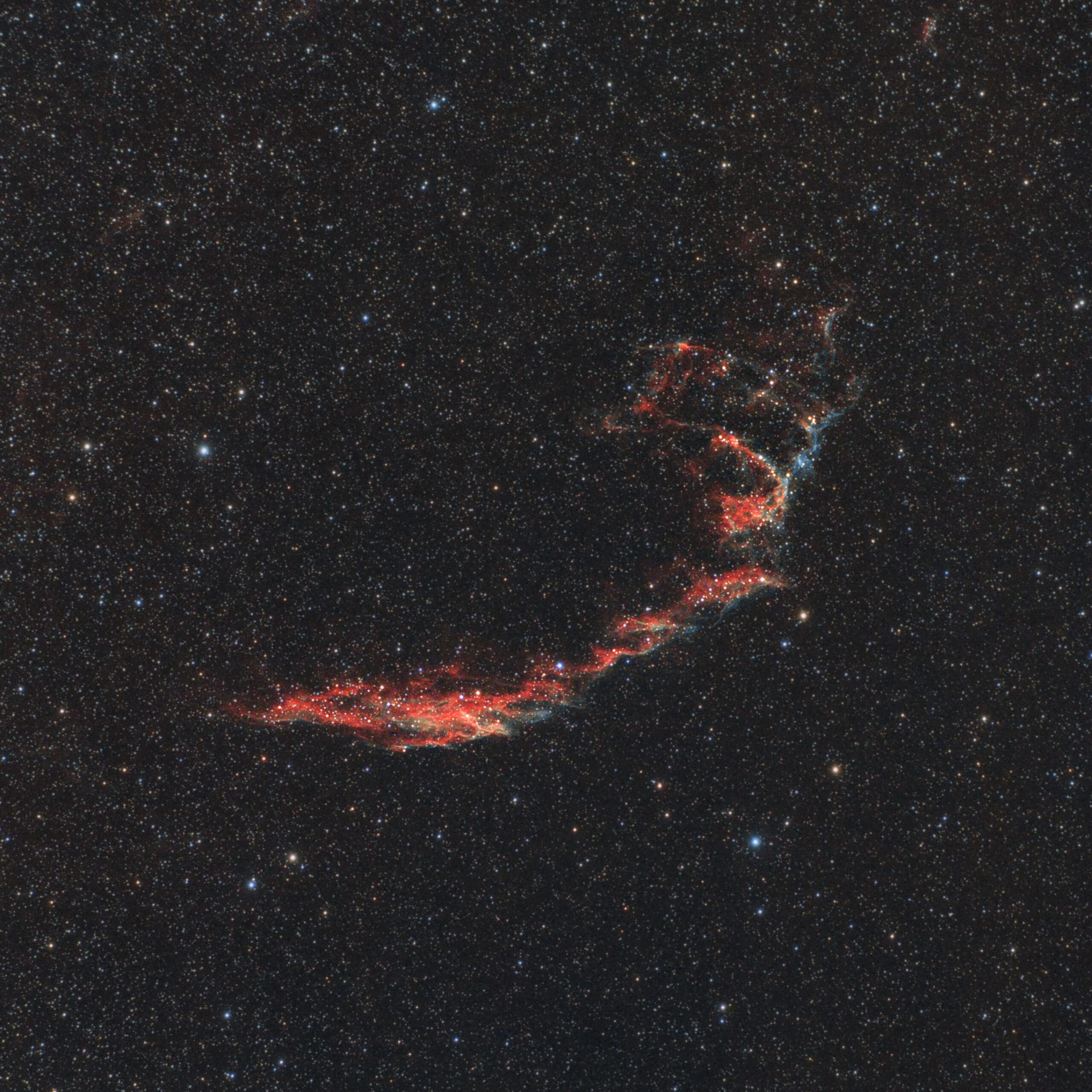 Per ottenere questa immagine della nebulosa "Velo" est ho integrato 95 raw da 180" di esposizione l’uno, con 25 dark, 41flat e bias, mediante un Evostar 72ED, una Canon EOS1200D modificata, un filtro Hutech LPS D1, inseguimento con una montatura EQ5.