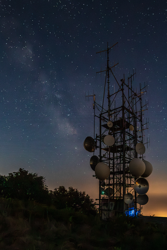 Il Monte della Stella è un massiccio che sorge nel parco nazionale del Cilento e la sua vetta conica, a meridione (1131 m.l.m.), fu spianata per costruire la grande sfera del radar dell’ENAV per il controllo del traffico aereo dei settori Est del Tirreno Centrale e del Tirreno meridionale, abbassando la quota del monte (m.1100 s.l.m.). In primo piano, nello scatto, è presente una delle diverse antenne di telecomunicazione presenti sulla sommità del monte. Sullo sfondo, la Via Lattea ripresa con questo singolo scatto effettuato senza alcun astroinseguitore ma usando la regola NPF per ottenere il giusto compromesso nella puntiformità delle stelle. 15 secondi di esposizione a 3600ISO, f/5, post produzione con Lightroom.