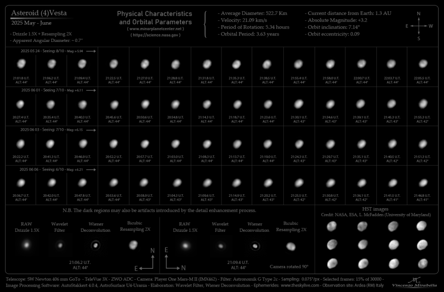 L’asteroide (4) Vesta, scoperto in Germania nel 1807 dall’astronomo Heinrich Wilhelm Olbers, è uno dei corpi celesti più studiati del nostro Sistema Solare. Il numero (4), prima del nome, indica che è stato il quarto asteroide ad essere stato scoperto. Con un diametro medio di 522.7 km, è il secondo asteroide per grandezza della fascia Principale situata tra Marte e Giove. La sua luminosità, osservato dalla Terra, varia durante l’orbita attorno al Sole. Con una magnitudine apparente massima di +5.4 durante le opposizioni favorevoli, è l’asteroide più luminoso, risultando visibile anche ad occhio nudo sotto cieli bui.