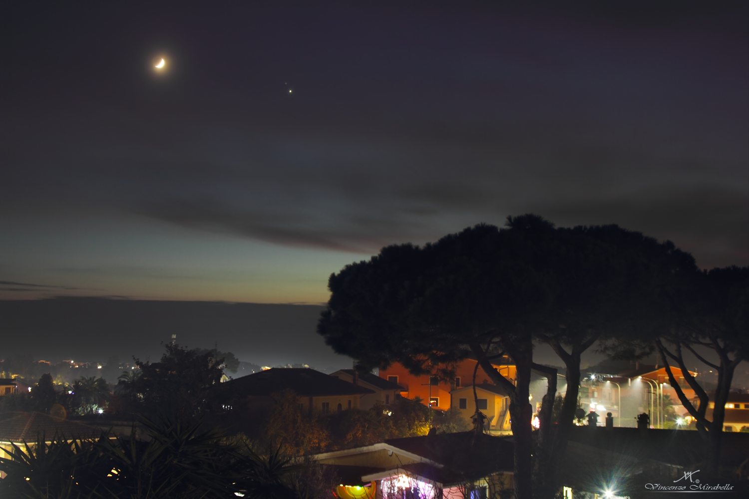 La congiunzione Luna-Giove-Saturno, fotografata da casa, la sera del 17 dicembre 2020 con una Canon EOS 550D su cavalletto.