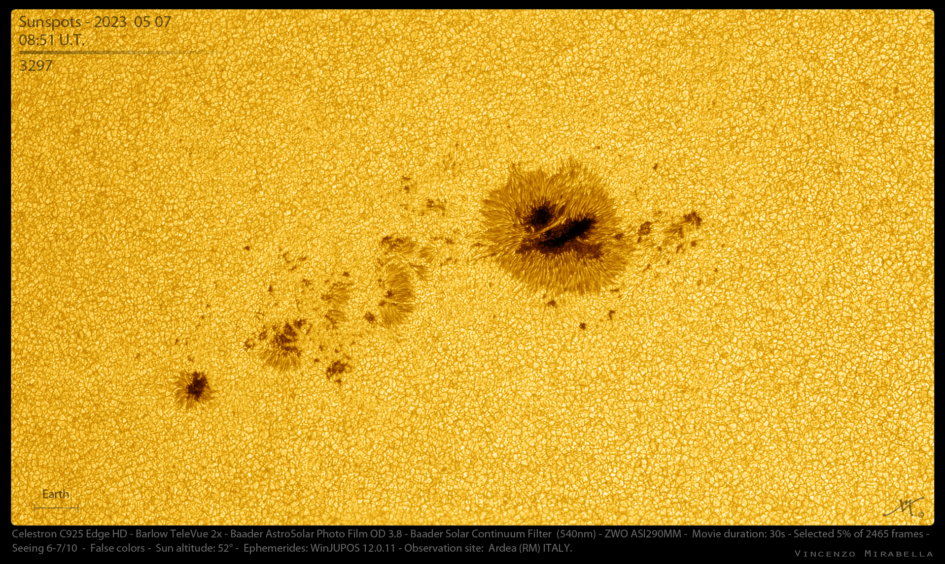 Spettacolari macchie solari catturate giorno 7 maggio 2023 attraverso un C925 Edge HD corredato di filtro AstroSolar OD 3.8 e filtro Baader Continuum (540nm). Le immagini sono state riprese in presenza di leggero vento e velature nuvolose.