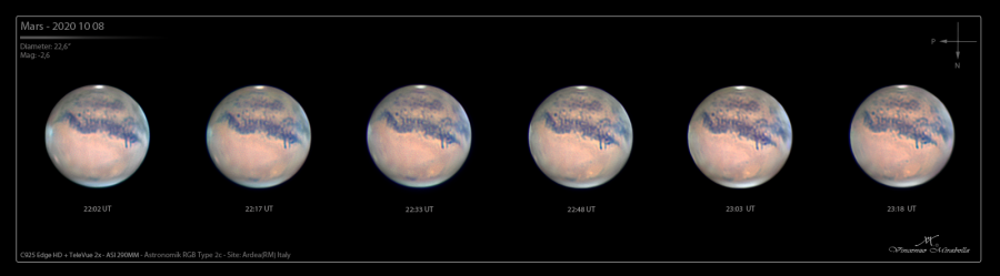 L’immagine mostra la rotazione del pianeta Marte in una sequenza di riprese effettuate dalle 22:02 UT alle 23:18 UT del 10 ottobre 2020. Il polo sud è in alto.
