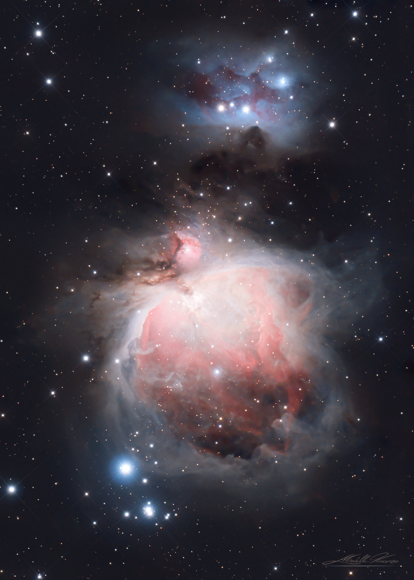 La "Grande Nebulosa di Orione" nota anche come M42 è una nebulosa diffusa tra le più belle del cielo, situata tra le stelle della Spada di Orione, nell’omonima costellazione, dista dalla Terra circa 1300 anni luce.