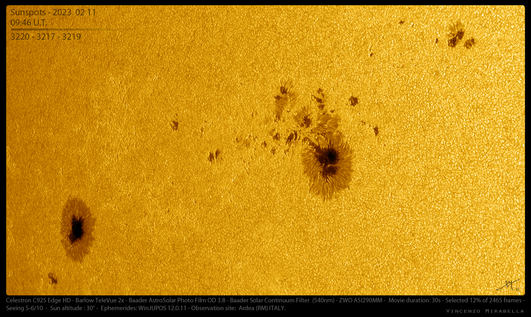 Gruppi di macchie solari (3220,3217,3219) fotografati l’11 febbraio 2023 con un telescopio C925 Edge HD, dotato di filtro AstroSolar OD 3.8 e di un filtro Baader Continuum (540nm).