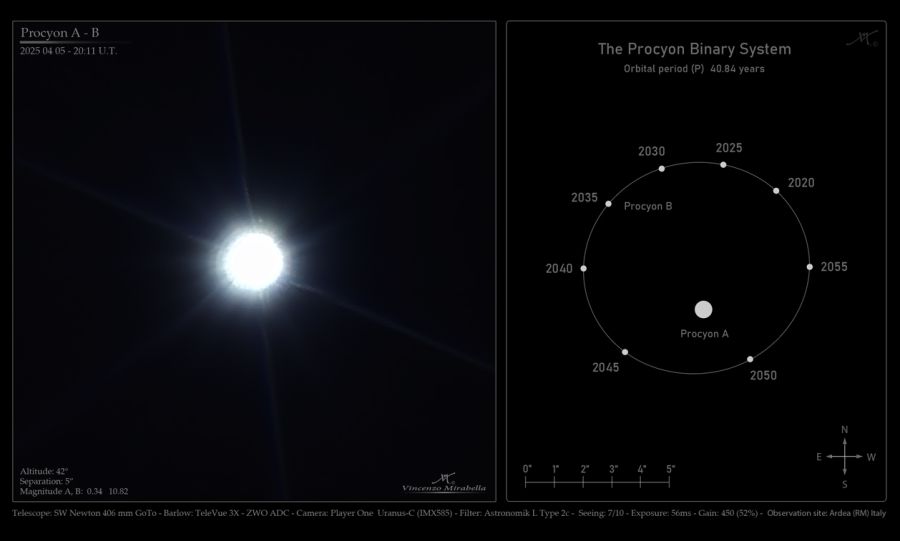 Osservare e fotografare la debole nana bianca Procione B è molto difficile a causa della grande differenza di luminosità tra le due componenti A-B e della piccola separazione tra le due stelle (circa 5" d’arco di distanza angolare nel 2025).