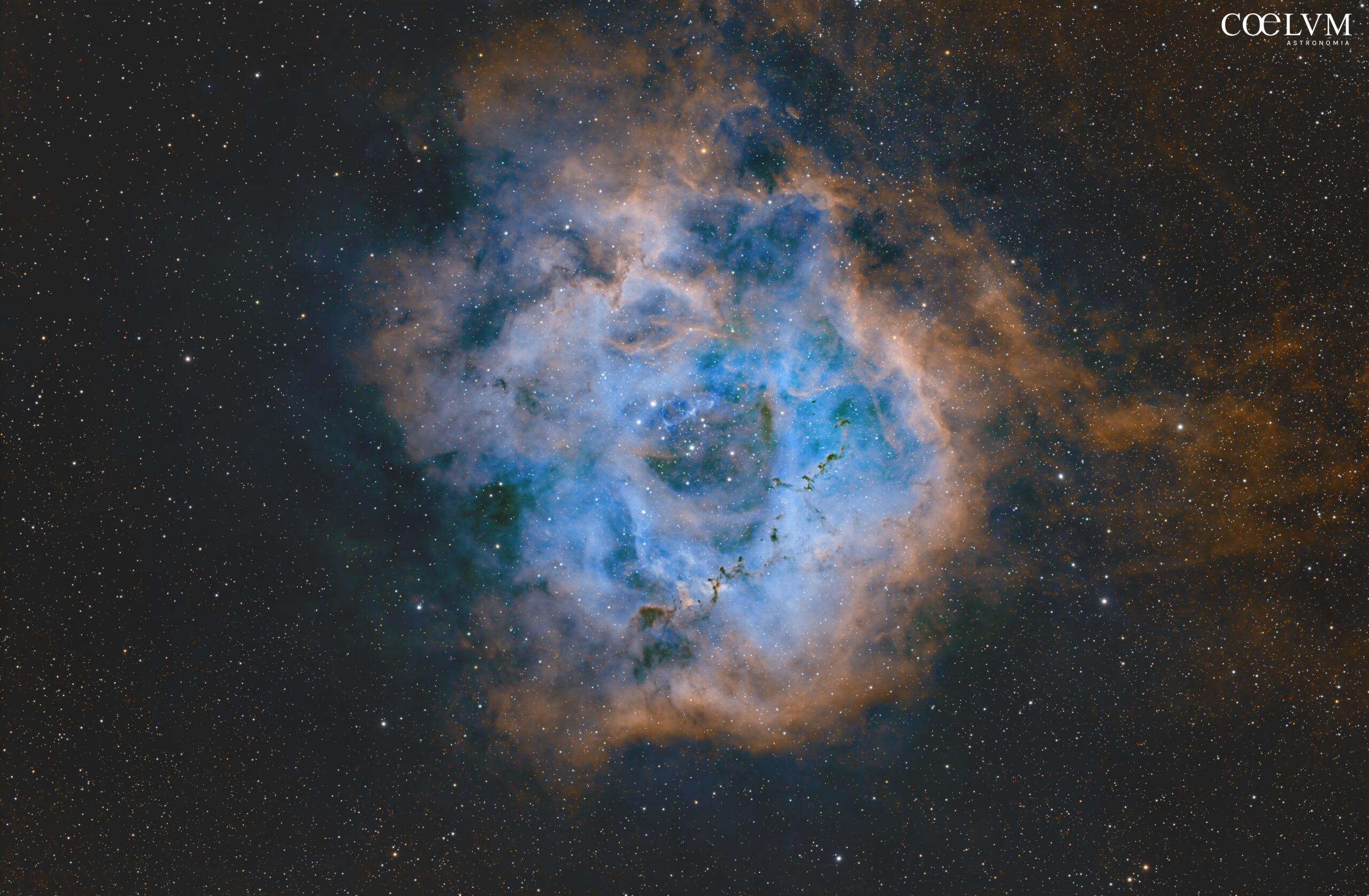La Nebulosa Rosetta è un’ampia regione H II di forma rozzamente circolare situata nella costellazione dell’Unicorno. La nebulosa ha un diametro angolare di 1,3° e si trova a una distanza di circa 5200 anni luce dal sistema solare; ha una dimensione approssimativa di 100 anni luce. Al centro della Nebulosa Rosetta si trova un brillante ammasso aperto, noto come NGC 2244; le stelle blu dell’ammasso emettono radiazione ultravioletta che eccita il gas della nebulosa. Si pensa che il vento stellare eserciti pressione sulla nube interstellare causando una compressione, seguita dalla formazione di stelle; nella regione infatti sono stati osservati molti globuli di Bok. Ho ripreso questa regione con il rifrattore TS 94 EDPH e la camera ZWO 2600mc pro su montatura ZWO AM5. Ho utilizzato due filtri in banda stretta sia per Ha-OIII (Optlong L-enhance) sia per SII-OIII ( Askar D) per circa 12 ore di integrazione dal mio cielo urbano per comporre la Hubble palette.