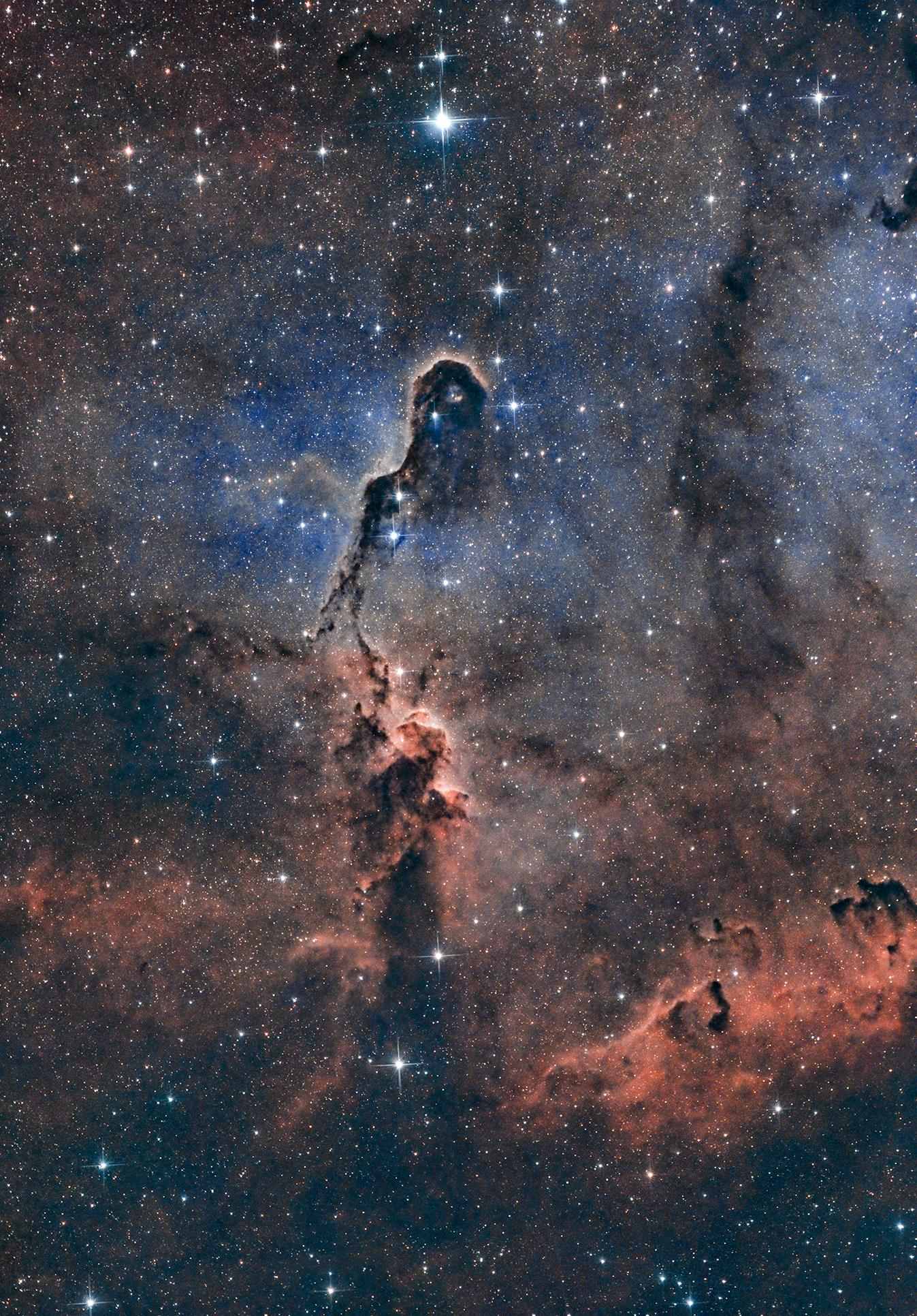 La nebulosa Proboscide di Elefante è una concentrazione di gas interstellare e polvere nell’ammasso stellare IC 1396, una regione di gas ionizzato situata nella costellazione del Cefeo a circa 2.400 anni luce dalla Terra. Il pezzo della nebulosa mostrato sopra è il globulo scuro e denso IC 1396A; è comunemente chiamata nebulosa Proboscide d’Elefante