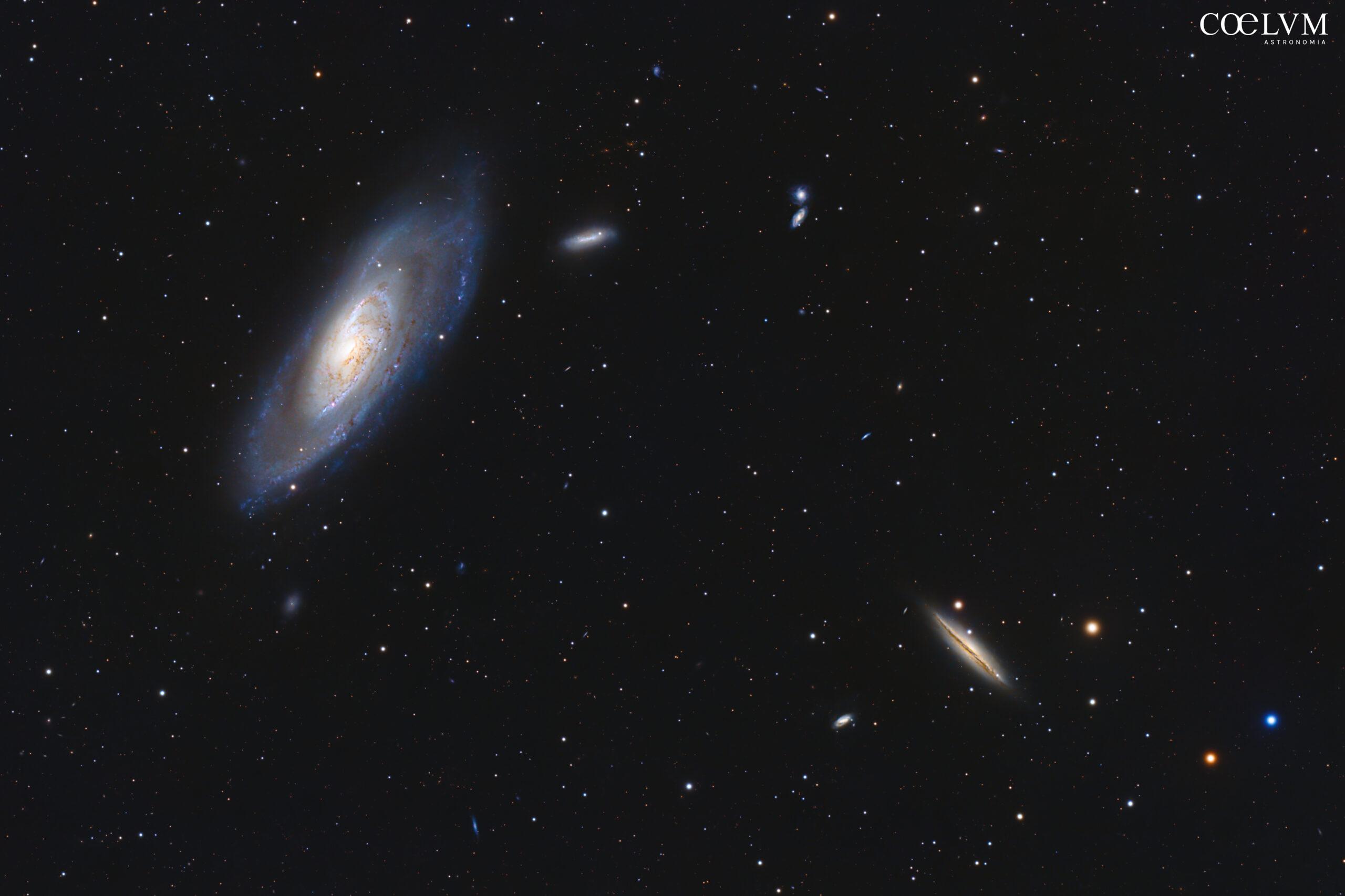 La primavera ci nasconde le regioni più luminose della nostra via lattea regalandoci però una finestra che si apre sullo spazio profondo permettendoci riprese ed osservazioni di oggetti estremamente distanti. Abbandonate regioni ricche di gas e polveri è il momento dell’anno da dedicare alle galassie. M106 è una galassia visibile nella Costellazione dei Cani da caccia, distante 23 milioni di anni luce. È osservabile con uno strumento di discrete dimensioni a metà strada tra la stella Phecda (Gamma Ursae Majoris) e la stella Chara (Beta Canum Venaticorum), con strumenti più piccoli è visibile soltanto la parte più brillante del nucleo, ammesso che si osservi da luoghi con poco inquinamento luminoso. La massiccia emissione di onde radio e raggi X fa dedurre che al centro abbia un buco nero super massiccio con una massa pari a decine di milioni di masse solari. Nei bracci si notano regioni più luminose di colore blu ricche di ammassi stellari. Pur non avendo utilizzato filtri a banda stretta, si cominciano ad intravedere anche regioni di colore rosso ricche di gas ionizzato, infatti sarebbe necessario effettuare una ripresa utilizzando un filtro HA per enfatizzare quest’ultime oltre a rendere visibili i vari sbuffi di idrogeno che la galassia emette. Nell’angolo opposto, a farle compagnia, c’è NGC 4217, una galassia distante 60 milioni di anni luce, che appare tagliata a metà da una banda di polveri oscure, grazie alla prospettiva che c’è la mostra perfettamente di taglio. La foto è frutto della somma di 120 scatti da 180 secondi, utilizzando un rifrattore Askar 120 apo spianato a focale nativa (840 mm) ed una camera Qhy294mc con filtro ir-cut, sfruttando, come consuetudine, il fine settimana di luna nuova, insieme agli inseparabili amici astrofili, sotto il bel cielo del sud della Toscana, più precisamente in quel di Cinigiano. Spero vi piaccia. Emiliano Moretti