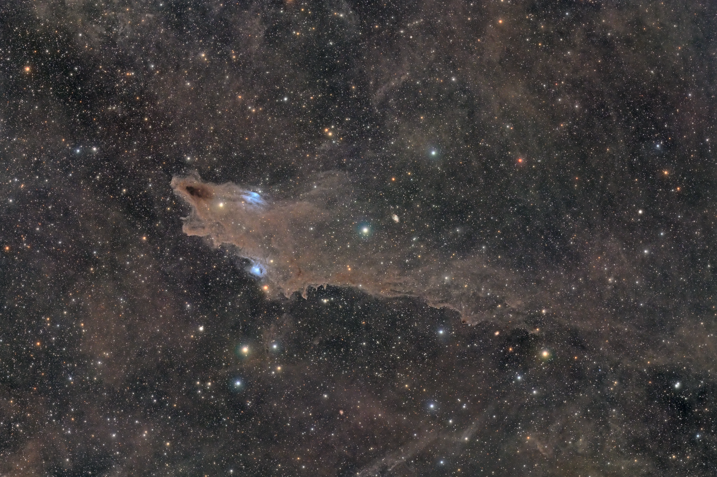 Uno squalo all’attacco. Così si presenta la nebulosa oscura LDN 1235, in direzione della costellazione Cefeo. La sua particolare forma la rende uno degli oggetti più straordinari e curiosi di questa parte di cielo. Le nebulose oscure sono oggetti molto difficili da individuare, a causa sia della loro bassa temperatura, sia della loro composizione responsabile dell’assorbimento della luce. Le nubi oscure, quindi si possono osservare se oscurano parte di una nebulosa a emissione, o nebulosa a riflessione, oppure quando bloccano la luce proveniente dalle stelle di fondo.