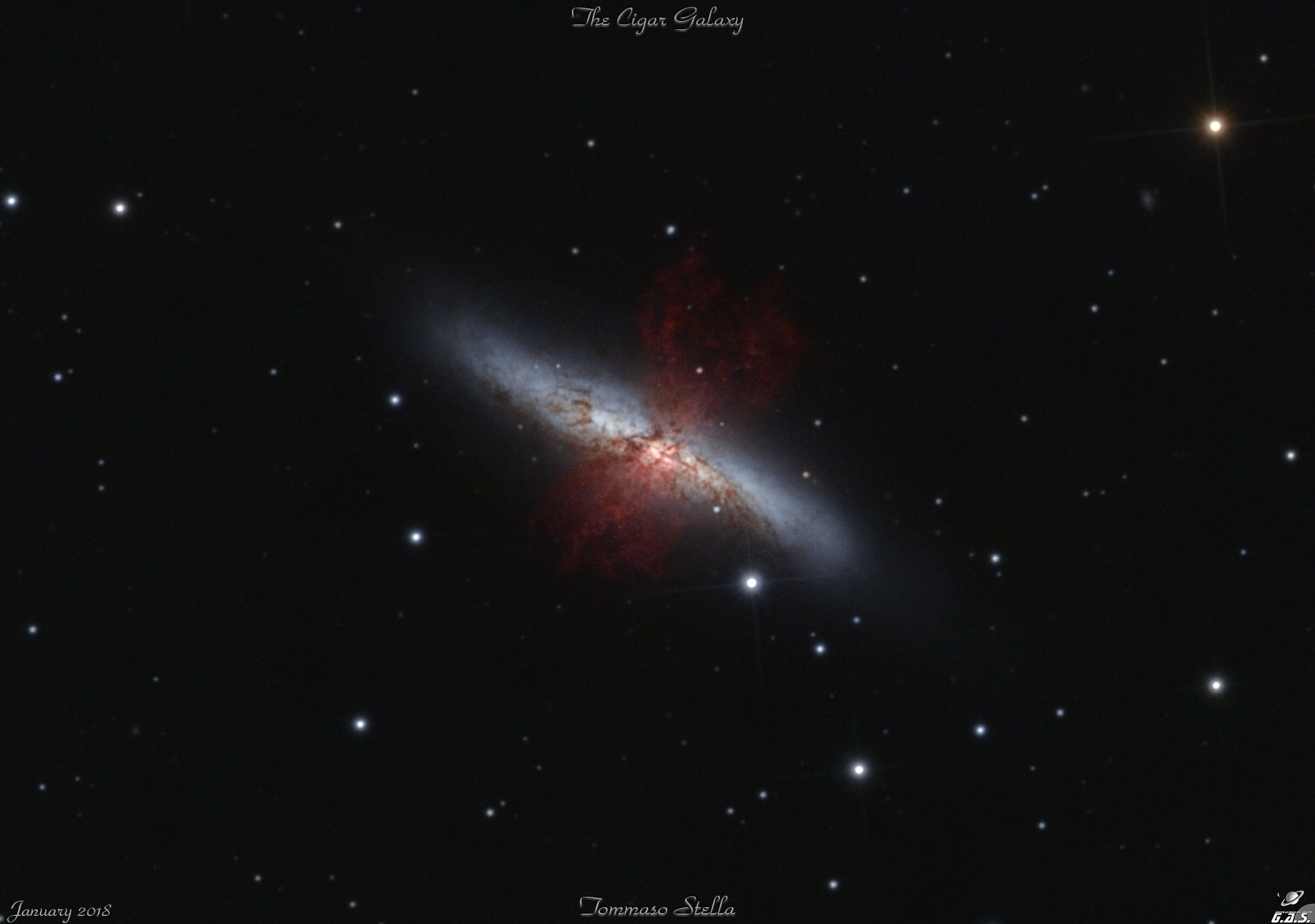 Le pose brevi (10 secondi) sono state utilizzate per ottenere i dettagli della parte centrale della galassia mentre per evidenziare la zona rossastra è stato necessario esporre per tempi più lunghi (60 secondi).