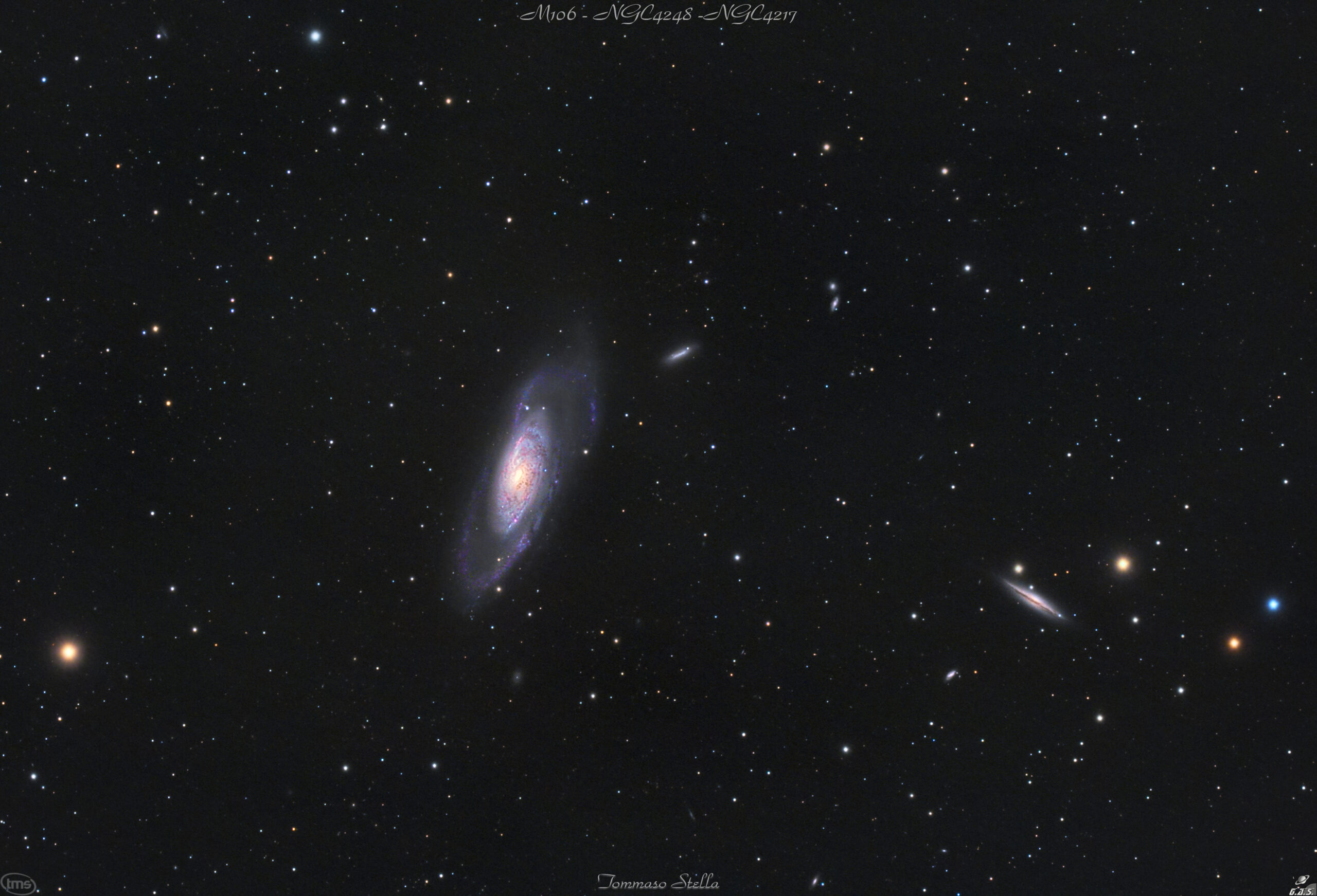 Nelle sue vicinanze (solo prospettiche) possiamo individuare diverse galassie molto più lontane e deboli fra le quali NGC4217 distante 60 milioni di anni luce (in basso a destra) e NGC 4248 a ‘soli’ 24 milioni di anni luce da noi (nella foto è vicina a M106 in alto a destra).