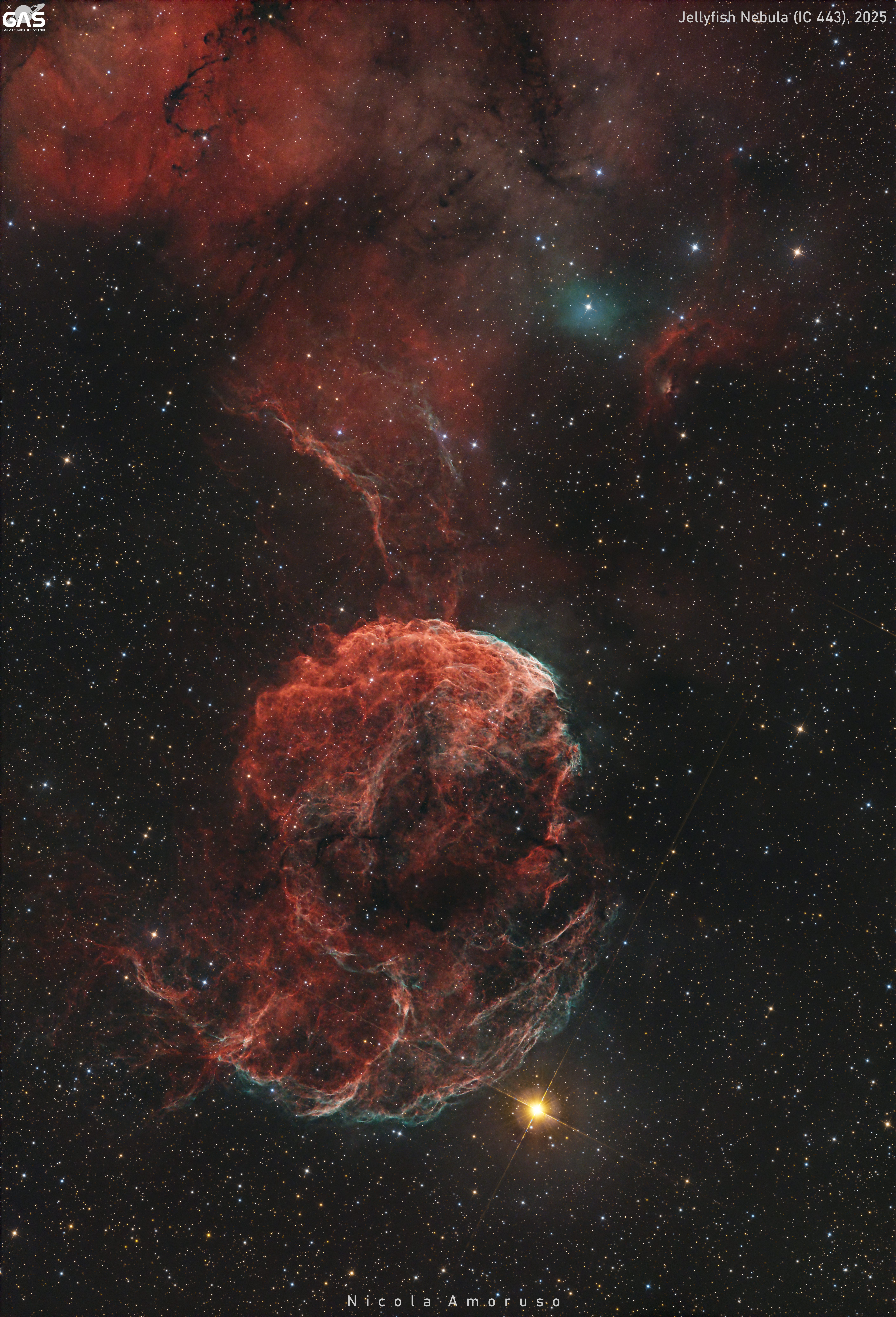 IC 443, o Nebulosa Medusa, è un resto di supernova nei Gemelli a 5.000 a.l., formatosi tra 3.000 e 30.000 anni fa. Ha un diametro di 70 a.l. e una struttura filamentosa influenzata da nubi molecolari. Il nucleo collassato ha generato la pulsar CXOU J061705.3+222127, una stella di neutroni densa e compatta con forte campo magnetico e rapida rotazione. Attorno alla pulsar è presente una struttura ad anello, probabilmente causata da onde d’urto.