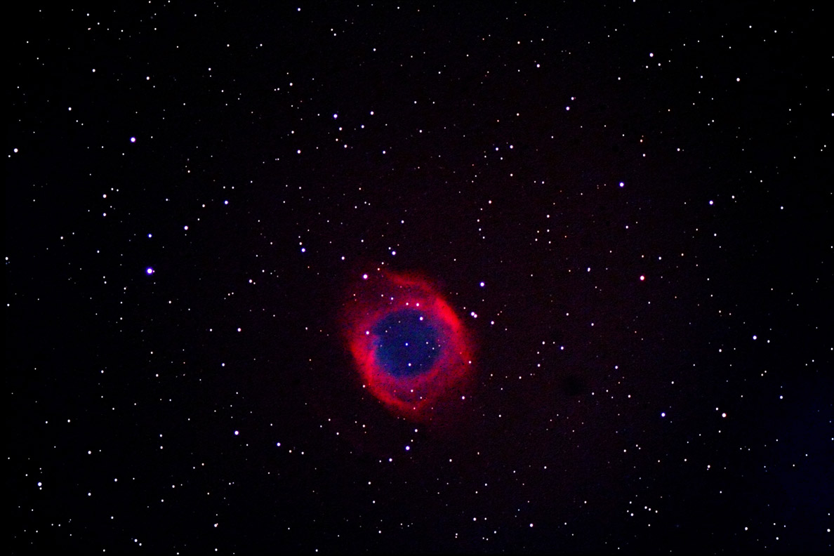 Nebulosa Helix ripresa da Montefiorino era visibile appena sopra le cime dei monti con scarso seeing. Ripresa effettuata con rifr. SkyWatcher 120ED con in parallelo per inseguimento rifr. Equinox 80mm oculare 12mm con reticolo barlow 3x , camera Canon Eos 350 D modificata , tutto su montatura EQ6 Sky Scan Pro .