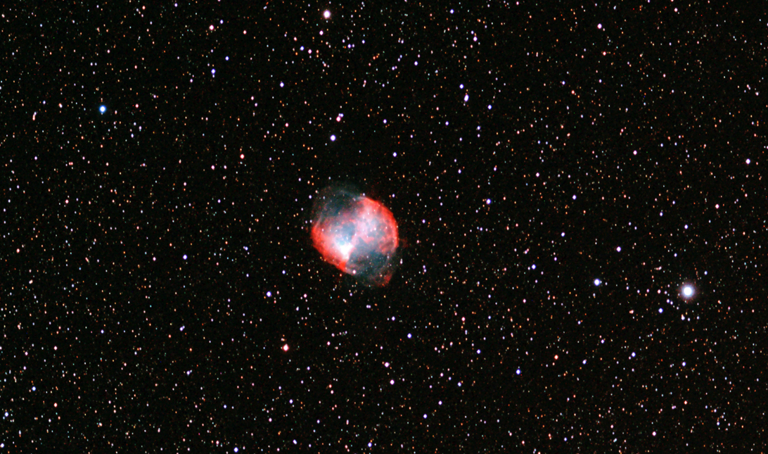 Ripresa della nebulosa M27, eseguita la sera del 02-09-2011 alle ore 01:00, seeing 4/10, n.12 imm. 300sec 800iso dark-flat-bias, rifrattore Apo S.W. 120mm f7,5, Canon eos 350D modificata DSRL-ACF, filtro Astronomik Eos Clip CLS.