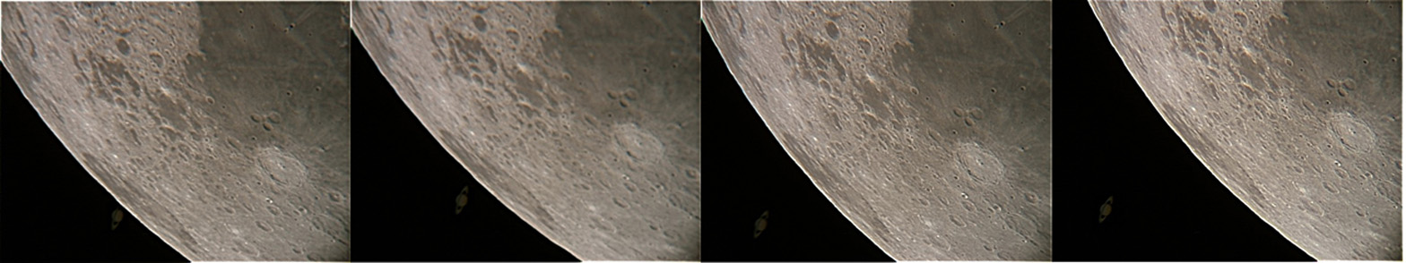 Egresso di Saturno dal disco Lunare. Il Pessimo seeing non mi ha permesso di riprendere l’intera sequenza dell’occultazione , fortunatamente sono riuscito con il metodo afocale a riprendere alcune sequenze dell’egresso del pianeta dal disco lunare . Consapevole della turbolenza atmosferica al momento della ripresa presento ugualmente il mio risultato . Rifrattore SkyWatcher 120ED su EQ6 SkyScan Pro Inseguimento Moon-Rate