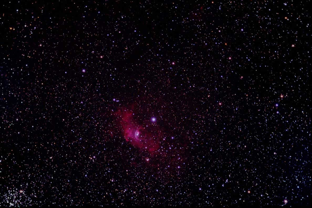 Ripresa della nebulosa diffusa NGC 7635 nella costellazione di Cassiopea. Ripresa effettuata con rifr. SkyWatcher 120ED con in parallelo per inseguimento rifr. Equinox 80mm , oculare 12mm con reticolo più barlow 3x , camera Canon Eos 350 D modificata filtro Baader , tutto su montatura EQ6 Sky Scan Pro .