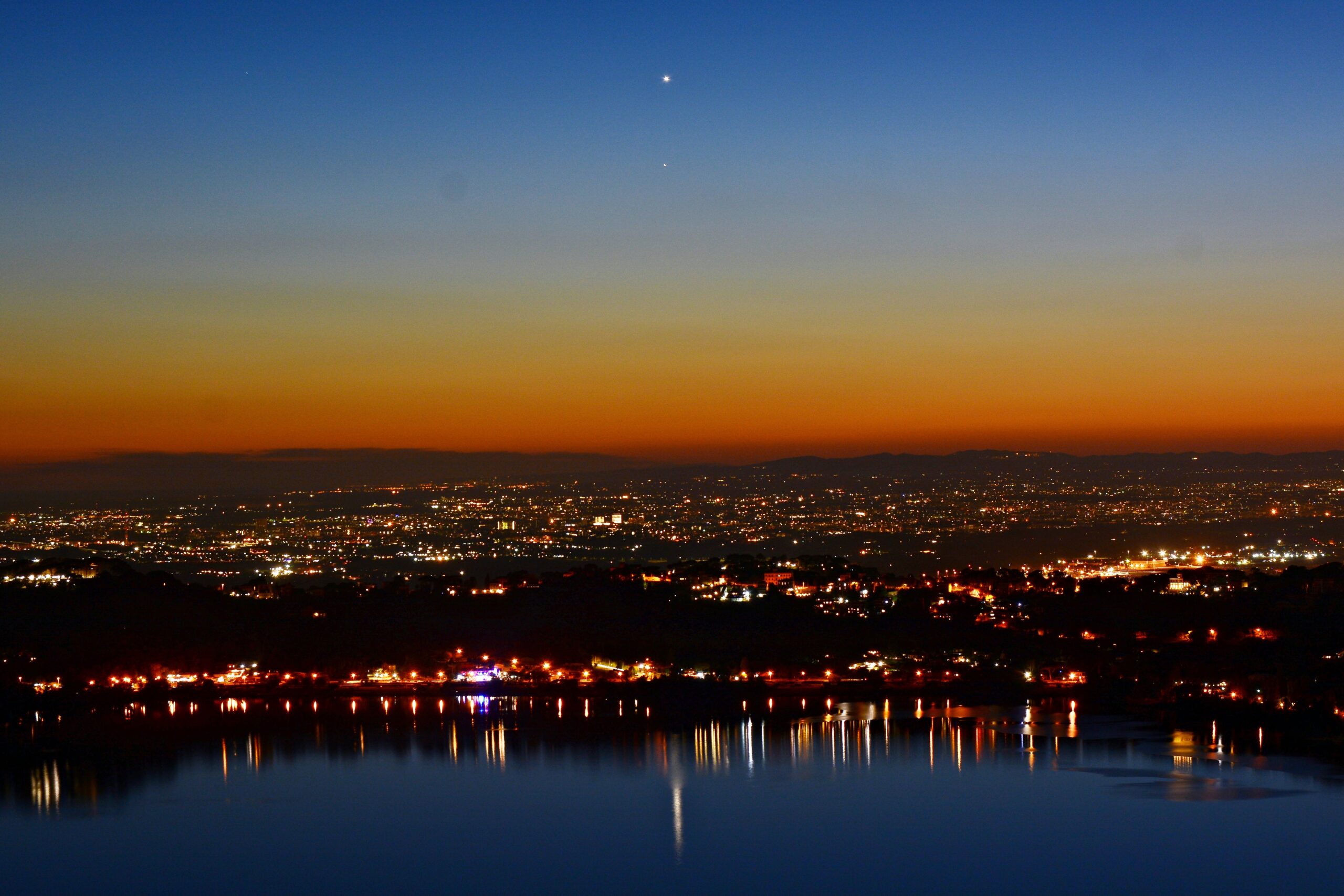 Idue pianeti tramontano sulle luci della città eterna e si riflettono nelle acque del lago Albano