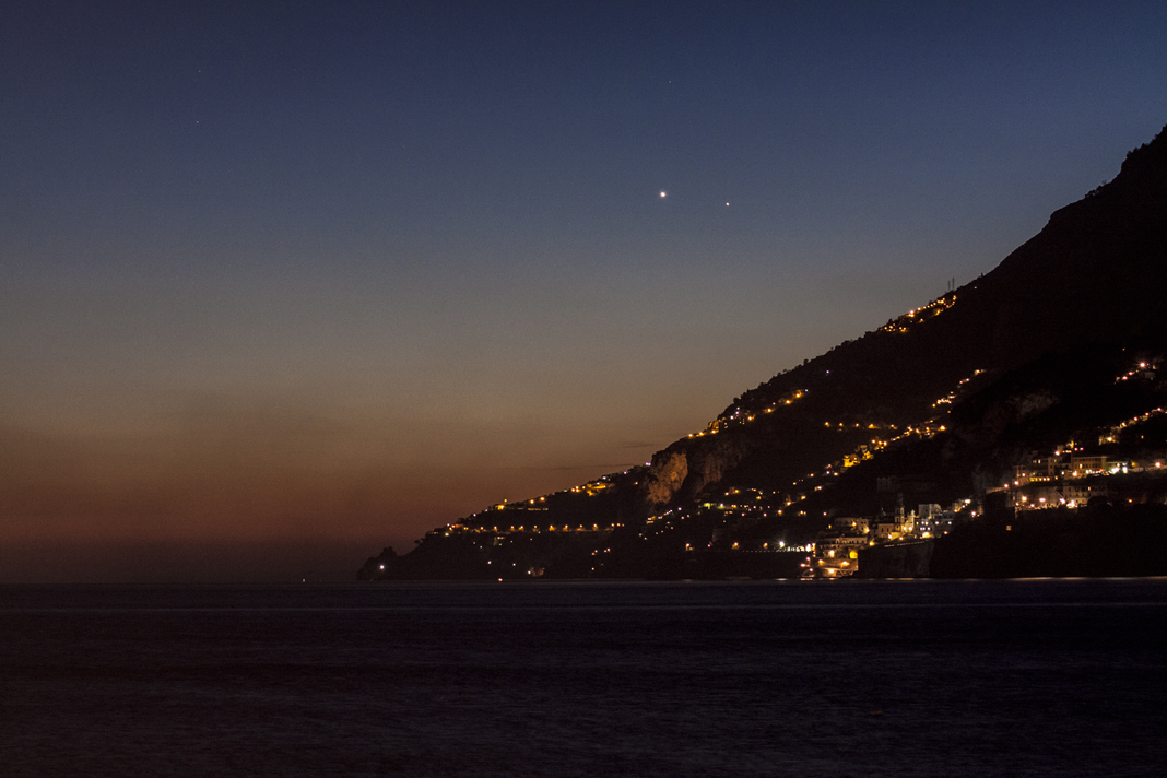 Congiunzione dei pianeti Venere e Mercurio al tramonto. Costiera Amalfitana.
