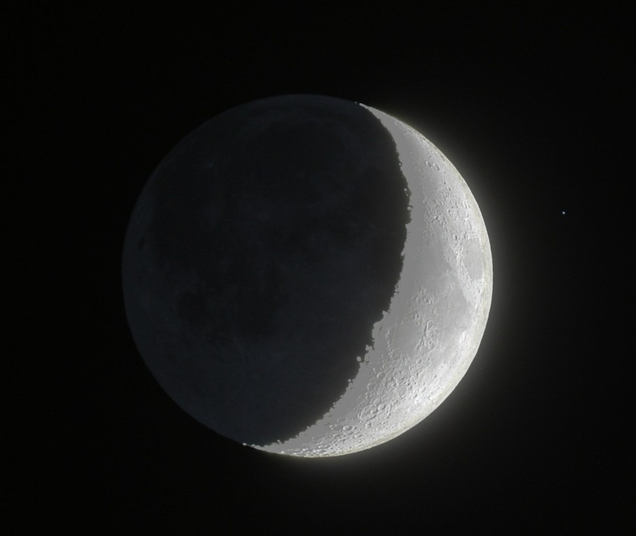Luce cinerea + parte illuminata. Cinque immagini da 1/125 a 1/250 sommate con Registax 4; risultao mediato in Astroart 3 con una immagine della luce cinerea di 6 sec.