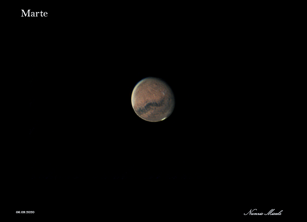 Dopo giorni di pessimo seeing il cielo mi ha regalato questa notte delle riprese ricche di dettagli. Marte presenta la calotta sud di acqua ghiacciata e ghiaccio secco (anidride carbonica allo stato solido) in ritiro in quando il pianeta si avvia all’estate, sul bordo una coltre di nubi e foschie.