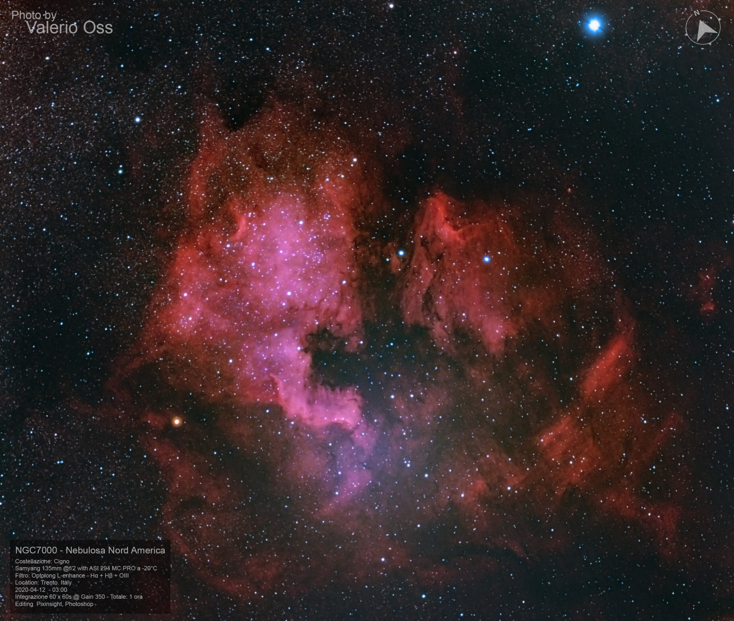 Elaborazione della nebulosa ad emissione Nord America NGC7000 nel cigno, ripresa con obiettivo Samyang 135mm, camera ZWO ASI294MC PRO e filtro Optolong L-eNhance, su montatura Sky Adventurer. 60 pose da 60 secondi per un totale di 1 ora. Il filtro usato permette una selezione delle sole bande elettromagnetiche H alpha, H beta e O III, quindi utilizzabile anche sotto cieli molto inquinati come quello cittadino di Trento (scala Bortle 7)