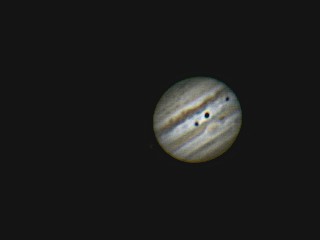 Filmato fatto con CPC 8 +barlow 2x+NexImage. L’immagine mostra lo spettacolo del transito dei due satelliti e delle loro ombre su Giove ,sul quale transita anche la GRS.
