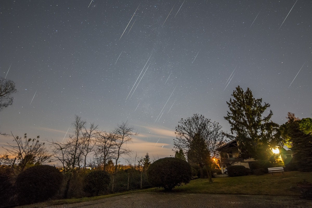 Il picco di attività delle Geminidi nelle prime ore della sera del 14 dicembre scorso dal cortile di casa, in direzione NW. Sono state catturate 25 meteore nel tempo di 105 minuti, prima che il cielo si coprisse per l’arrivo di nuvole da nord.