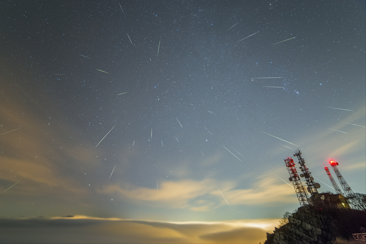 Immagine ripresa la sera del 13 dicembre scorso in occasione del picco di attività dello sciame delle Geminidi. Si possono contare 39 tracce di meteore catturate durante le notti del 13 e 14 in 5 ore complessive, nei momenti in cui il cielo era abbastanza libero da nuvole. In basso, le luci di Varese sotto il mare di nuvole.