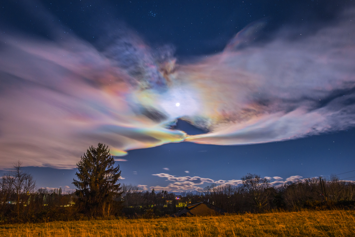 Dopo una giornata caratterizzata da una tipica situazione di foehn, vento caldo e secco di caduta dalle Alpi con temperature molto alte per la stagione, dopo l’apparizione di nubi orografiche dai colori assolutamente incredibili, ho atteso che la Luna si trovasse a passare dietro alcuni di questi altocumuli, rimasti ancora stazionari nel corso della notte. Queste nubi si sono accese con colori che mai mi era capitato di catturare, per cui ne è valsa la pena di attendere oltre le 2 di notte! HDR ottenuto con una Canon 6D con obiettivo da 28 mm. su treppiede.