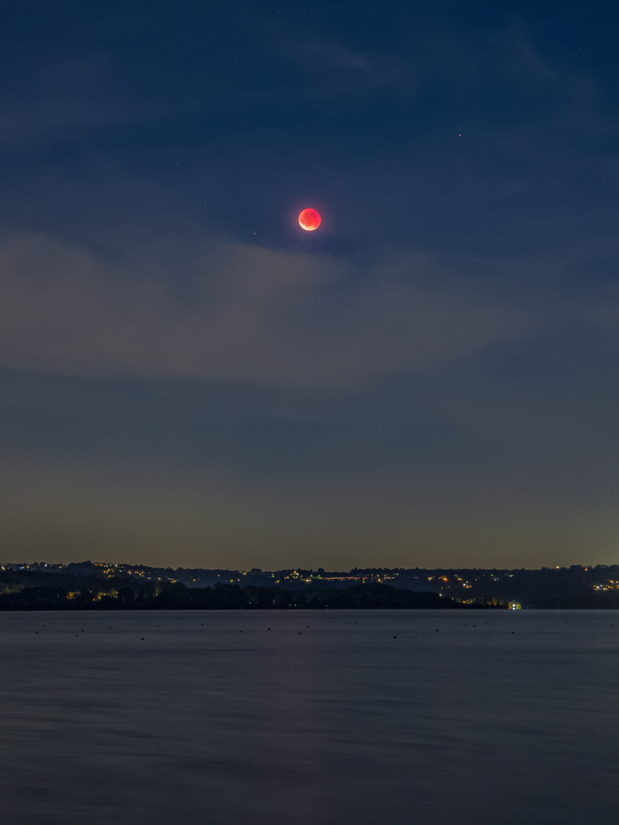 La Luna appena fuori dalla totalità ripresa sul lago di Varese, in una serata purtroppo non particolarmente limpida.