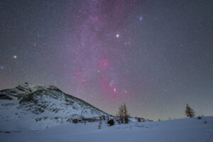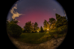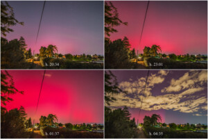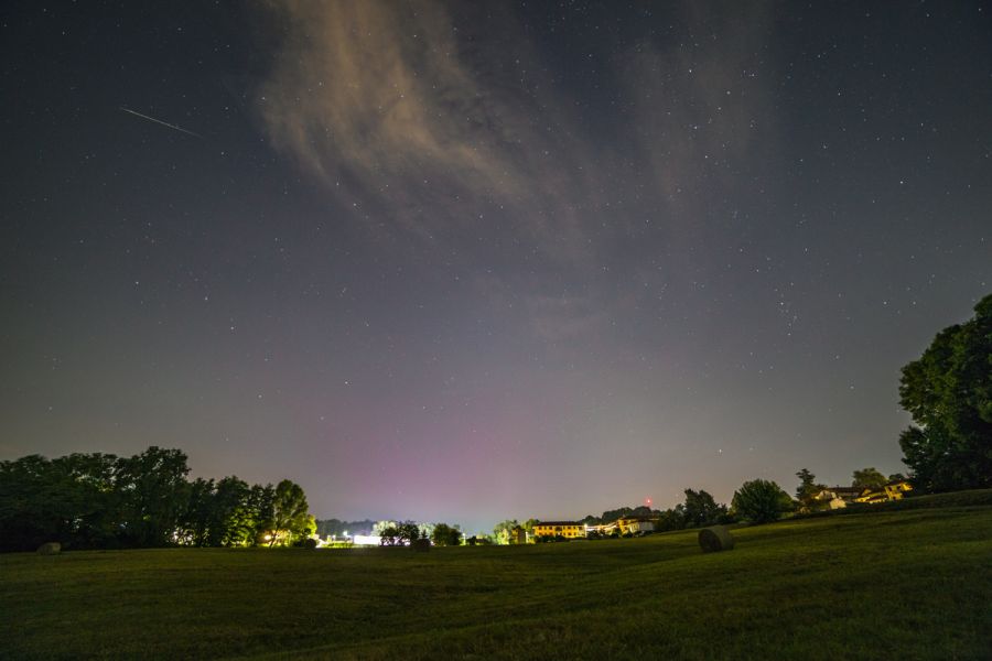 Caccia all’aurora durante la recente tempesta che ha raggiunto il grado G4, con avvistamenti anche a latitudini molto basse negli USA. Dal nord Italia, nonostante l’attività elevata, non si è osservato nulla, finchè, quando il livello è sceso a G2, un debole colore rosso si è manifestato per pochi minuti sull’orizzonte nord, assolutamente invisibile ad occhio nudo. In quel momento si sono accese anche diverse Perseidi, alcune molto luminose. Durante la sequenza di scatti una di queste ha impresso una traccia sul fotogramma.
