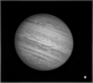 Giove e Ganimede. Quattro elementi hanno contribuito a questo risultato, anche se non perfetto; un seeing più che buono, un ottica (anche se solo 200mm) storica, la tecnica moderna della DMK41 e non per ultima la passione.