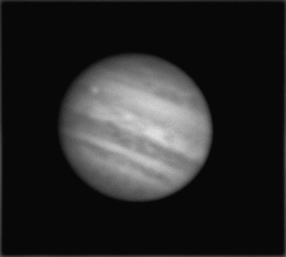 Transito di IO su Giove. Sempre nella stessa serata, turbolenta ma tersa, questa immagine ripresa con la DMK41mono. A sx quasi al lembo di Giove si scorge la pallina più chiara del satellite Io, che sta transitando. Particolare bel visibile sullo schermo video, anche in fase di ripresa.