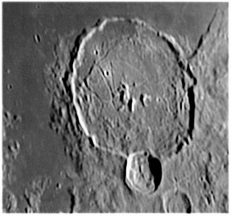 GASSENDI,Primo Piano con evidenti numerose sottili crepe che solcano e rendono cartteristico l’ interno di questo enorme cratere, diametro 110 Km . Ancora una ripresa all’alba del 06 giugno, falce di Luna calante con seeing sufficiente.