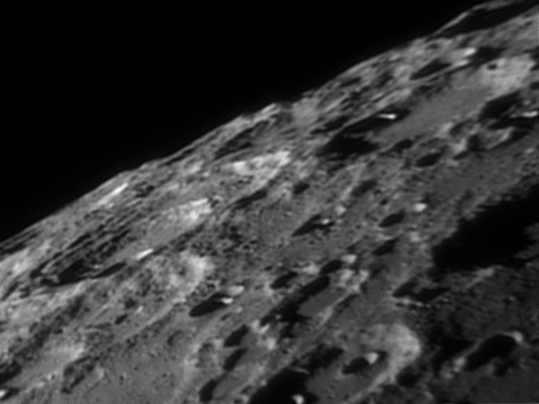Proflo del lembo lunare sud, in una serata discreta come seeing. Immagine ottenuta con Newton MARCON 200mm e Magzero mz5 in proiez.oc 8mm Televue.
