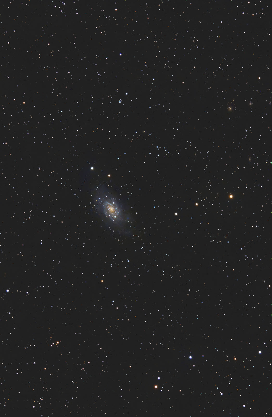 Ngc2403 immersa in campo stellare ed in compagnia di oltre 50 galassiette. Il Nord è a sinistra. Somma di 27 immagini da 6 minuti a 800 ISo. Calibrazione, somme ed elaborazione IRIS e PS.