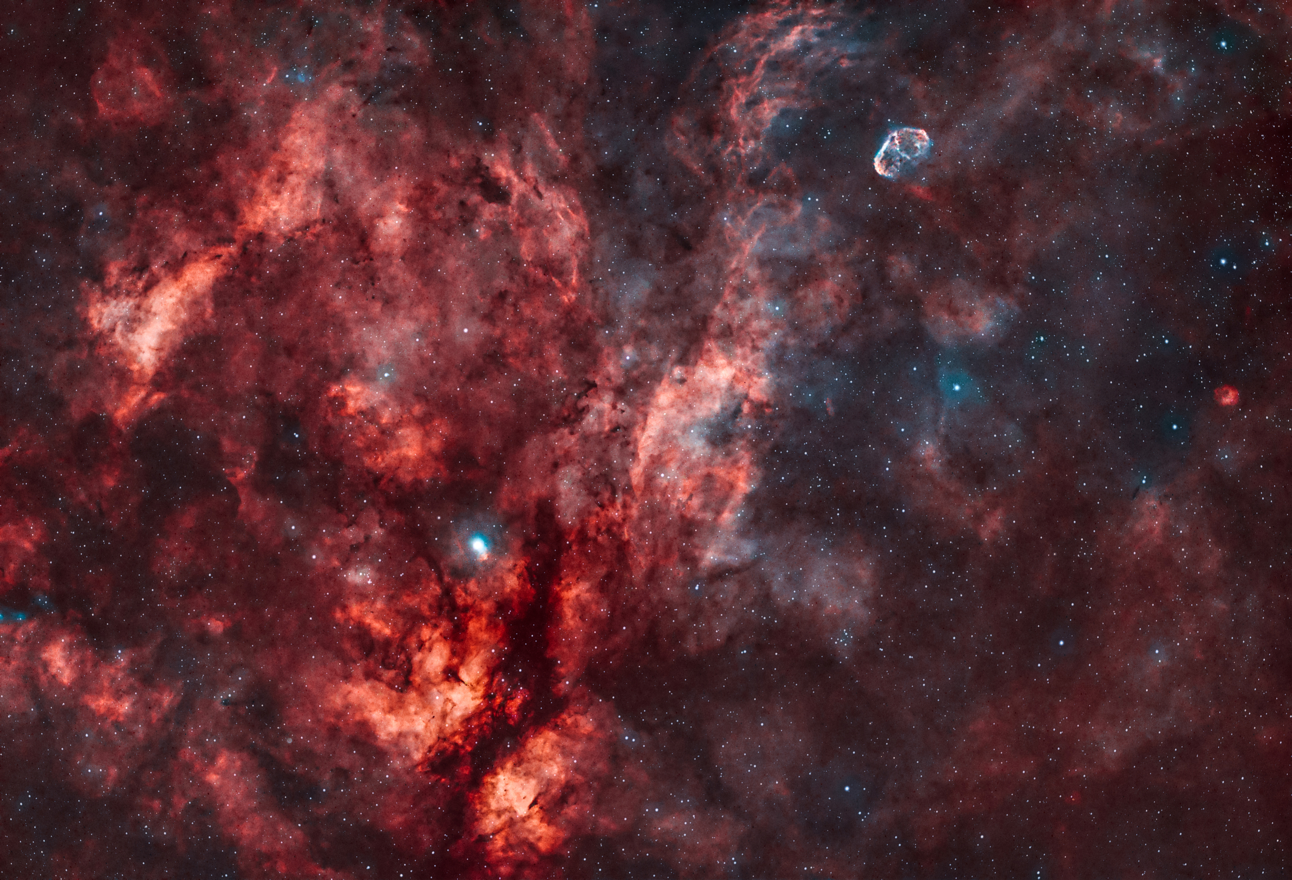 Poco distante, nella stessa zona di cielo, si trova NGC 6888 (nota anche come Nebulosa Crescente o con la sigla C 27), una nebulosa diffusa situata a circa 5.000 anni luce di distanza dalla Terra. All’interno della nube è visibile la stella centrale, classificata come stella di Wolf-Rayet (WR 136). Questo astro ardente sparge il suo involucro esterno tramite un forte vento stellare, espellendo l’equivalente di una massa solare ogni 10.000 anni. Le complesse strutture della nebulosa sono probabilmente il risultato del poderoso vento che interagisce con materiale espulso in una fase precedente.