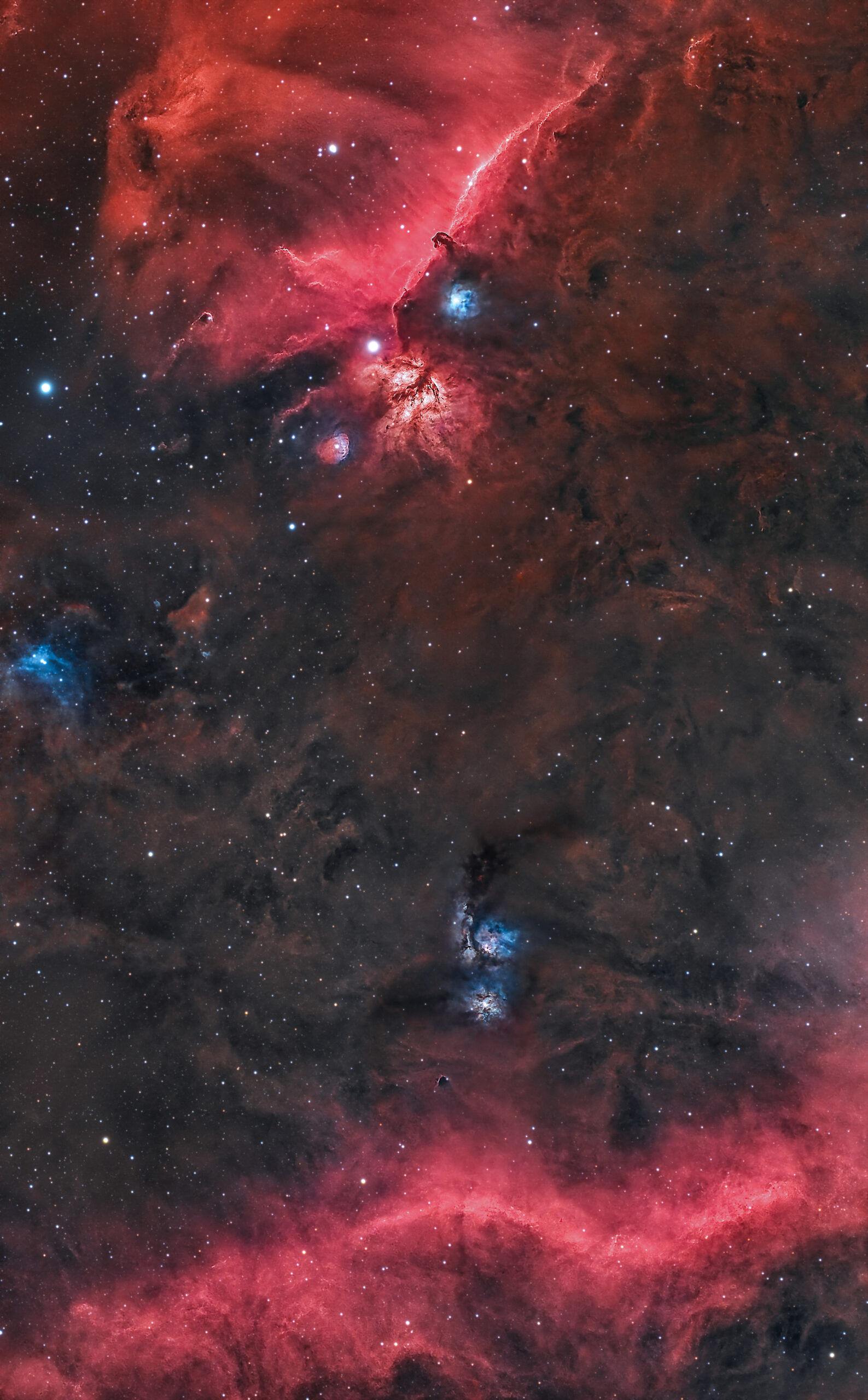 Siamo nei pressi della stella Alnitak, la stella più orientale della “cintura del cacciatore" dove si torva B33 o Nebulosa testa di Cavallo, una nebulosa oscura che si staglia contro il bagliore rossastro della nebulosa ad emissione IC434, originata dall’idrogeno ionizzato da Sigma Orionis. Dista circa 1600 anni luce. Al suo interno si stanno aggregando nuove stelle a causa del collasso gravitazionale delle sue zone più dense.