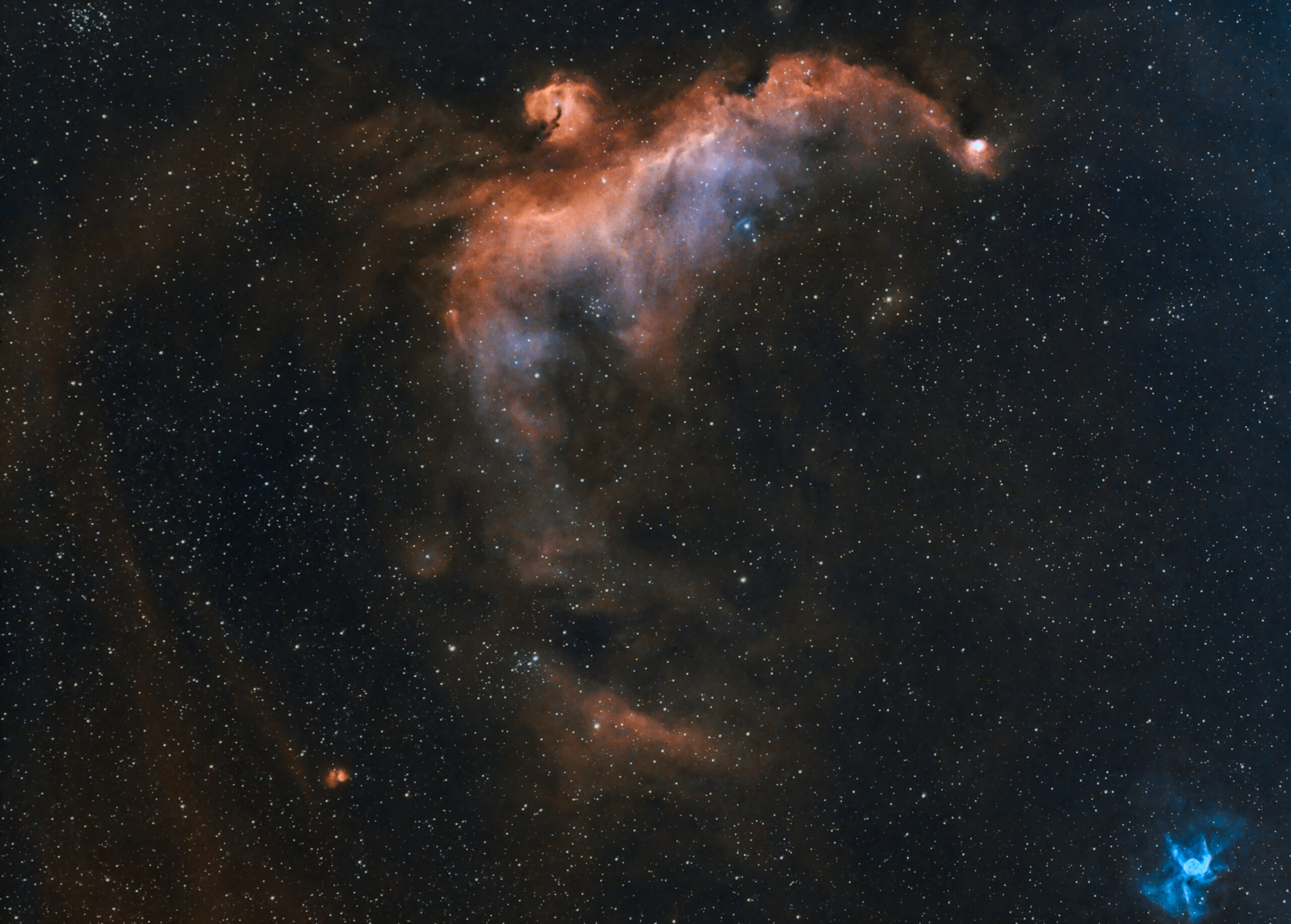 In basso a sinistra troviamo NGC 2359 o Nebulosa Elmo di Thor, nebulosa ad emissione che si estende per circa 30 anni luce e si trova a circa 15.000 anni luce di distanza. Al centro della nebulosa si trova una caldissima stella di Wolf-Rayet, che la illumina, ionizzando il gas che la circonda.