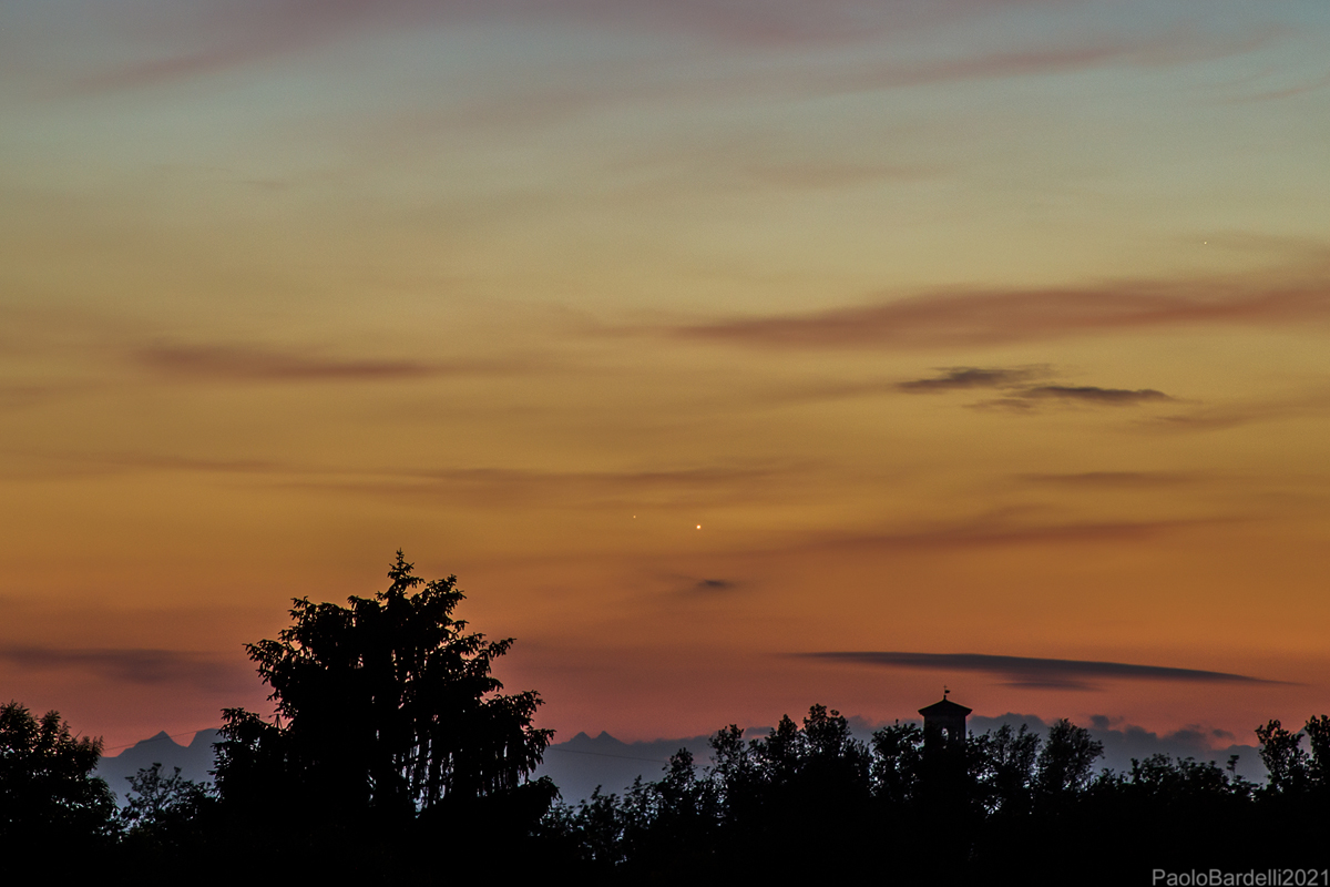 Il massimo avvicinamento serale tra Venere (Mv.-3,8) e Mercurio (Mv. 2,2), distanziati di circa 0,5°, ripreso nelle luci del tramonto la sera del 28 maggio. A differenza di Venere, Mercurio era assolutamente invisibile ad occhio nudo, anche per via della presenza di nuvole sottili. In alto a destra El-Nath, beta Tau (Mv. 1,6). Somma di 20 scatti da 1 secondo con una Canon 6D + 105 mm. (crop).