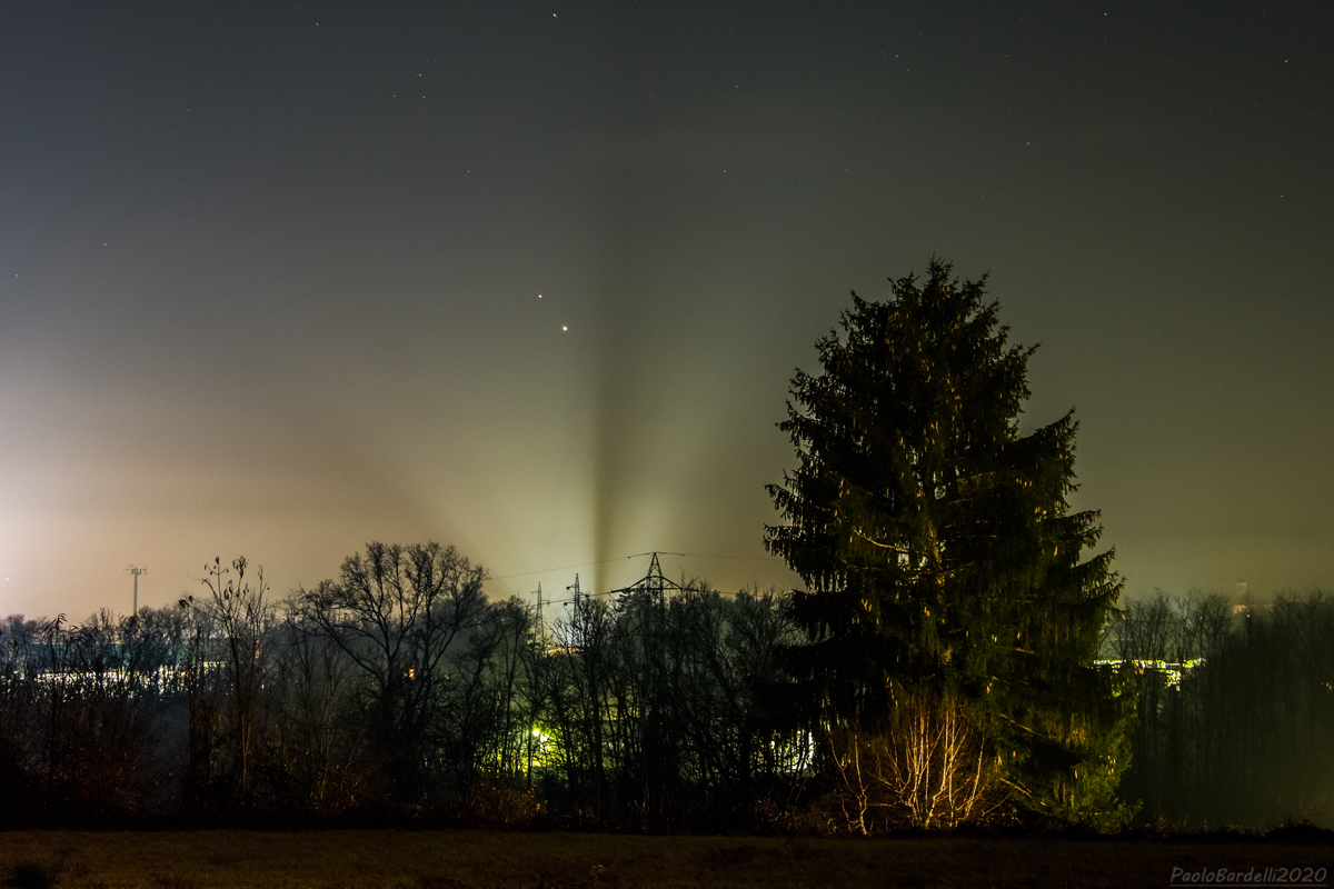 Giove e Saturno, ormai distanziati di circa 1°, "illuminati" da lampioni assolutamente fuori norma. Una leggera nebbia ha evidenziato questa situazione. Somma di 10 scatti da 6 secondi a 1000 ISO impilati con Sequator.