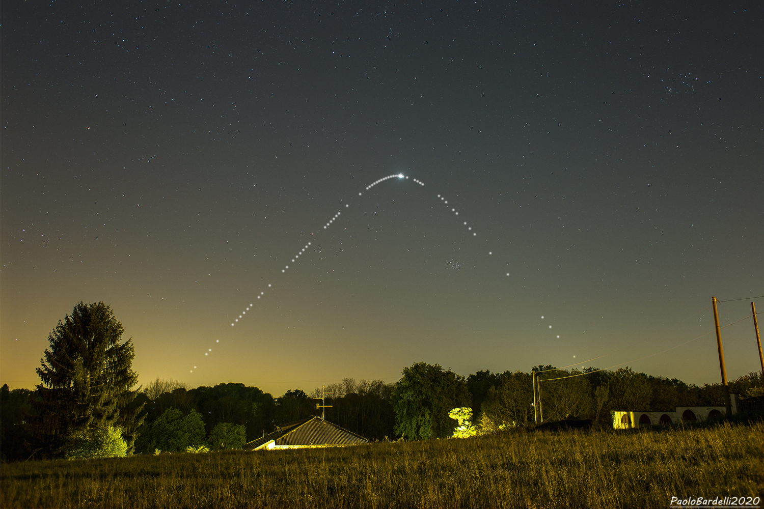 La sequenza del percorso apparente di Venere dal 7 febbraio al 24 maggio ripresa con una vecchia Canon 400d con un obiettivo da 28 mm. collocata in una postazione fissa. Somma di 66 scatti (su 107) realizzati alle ore 21:00:00 (ora solare), "ripuliti" con Photoshop CC ed impilati con Startrails. Lo sfondo è stato ripreso l’8 aprile, la serata migliore nel periodo in cui Venere era alla massima altezza, con una Canon 6d con un obiettivo da 28 mm. La sequenza è stata ridimensionata e sovrapposta allo sfondo. Astronomia "casalinga" ai tempi del COVID_19…