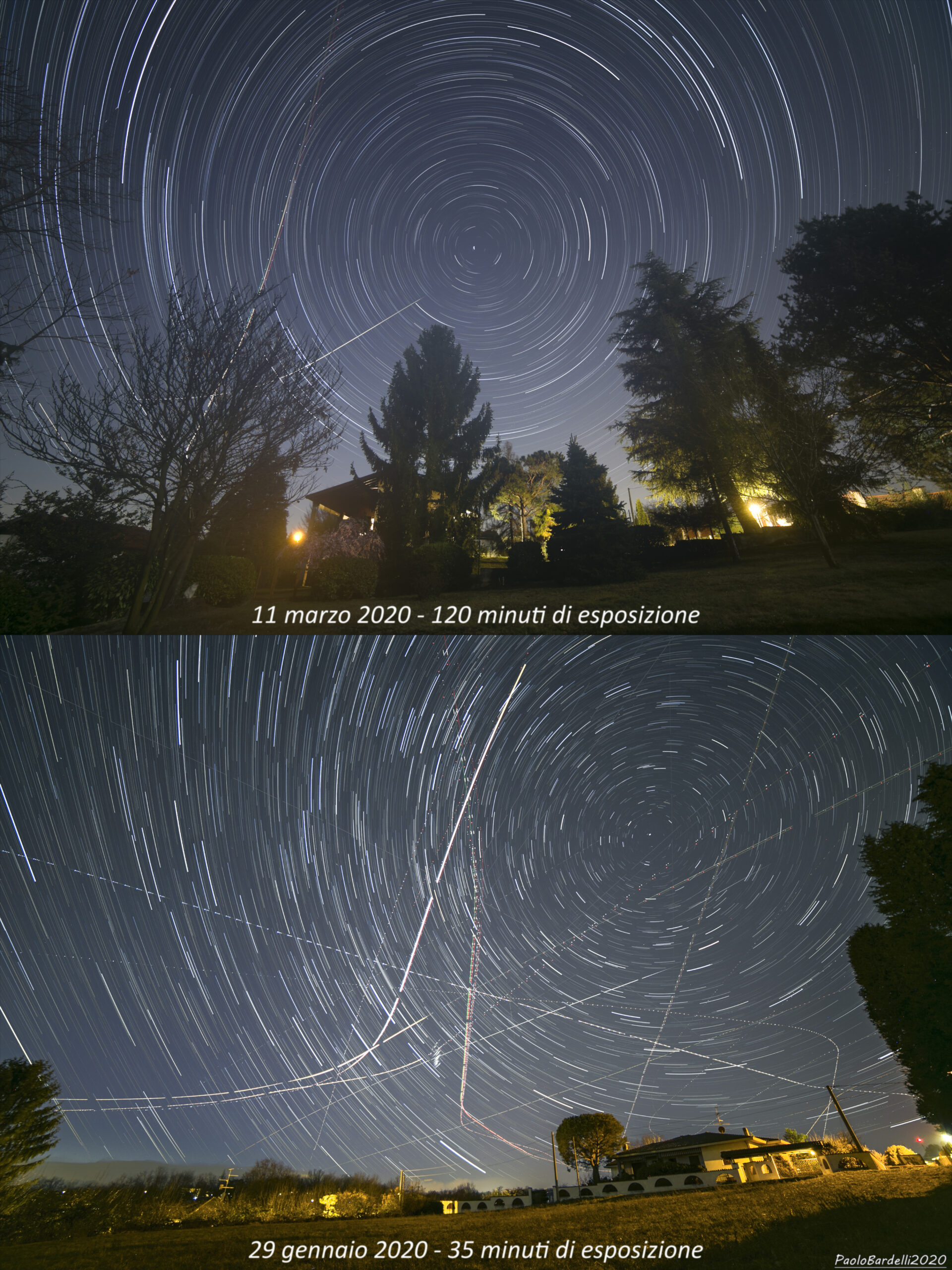 Abito a 15 km. dall’aeroporto di Malpensa, mi trovo sotto l’incrocio fra una rotta di decollo e una di atterraggio. Di notte, dal 20 al 30% delle foto a largo campo contengono almeno una traccia luminosa di qualche aereo. In questo periodo il cielo è quasi deserto, passano pochissimi voli. Ho deciso di documentare tutto questo con 2 immagini, la cui differenza è disarmante. Nella seconda, in mezzo a tutte le strisciate, si vede anche un "pacchetto" di flares del 3° gruppo di satelliti Starlink, sovrapposto ad un passaggio della ISS.