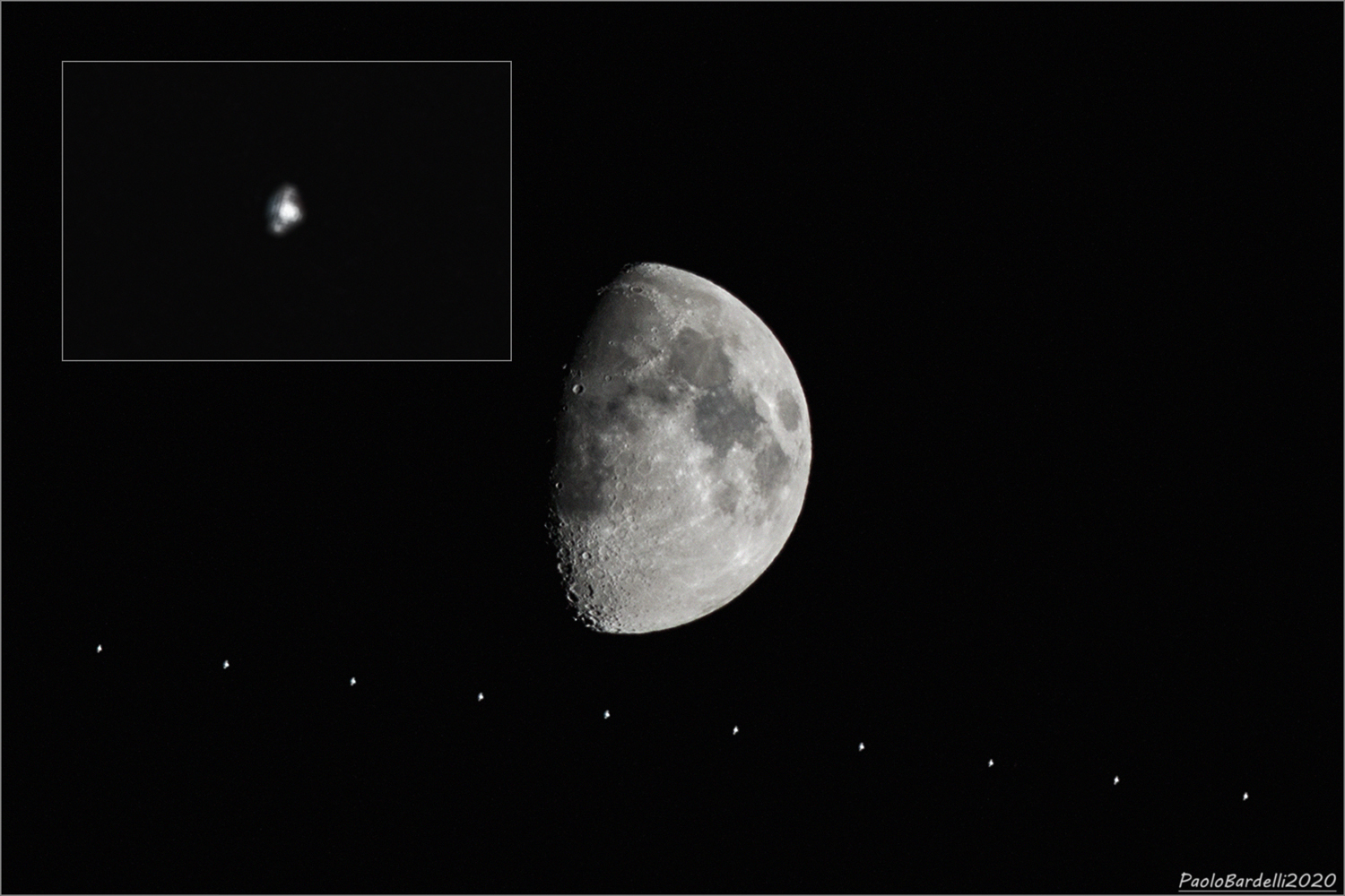 Il passaggio quasi radente alla Luna della ISS ripreso con una Canon 70D con tele da 200 mm. Somma di 10 scatti (raffica a 7 foto/sec.) con Photoshop CC, 100 ISO, 1/400 sec., f/3,2. Nel riquadro, un dettaglio ingrandito della Stazione Spaziale. E’ sorprendente come con un piccolo tele si riesca già a cogliere la sagoma di questo velocissimo oggetto, distante ben 400 Km!