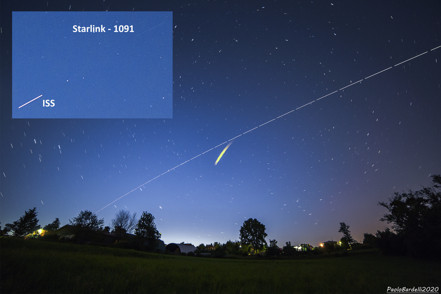 Il passaggio della ISS del 27 maggio che ha preceduto il lancio della Crew Dragon, purtroppo rinviato per maltenpo. e al centro della traccia della Stazione Spaziale, anzichè la capsula americana, una… lucciola! Nel riquadro, un dettaglio di uno scatto in cui si vede la ISS preceduta, prospetticamente (e pericolosamente?) dal satellite Starlink – 1091 (Mv. 4,6), praticamente sulla stessa orbita. Somma di 27 immagini riprese con una Canon 6D, Samyang 14 mm., 8 sec., 800 ISO, f/2,8.
