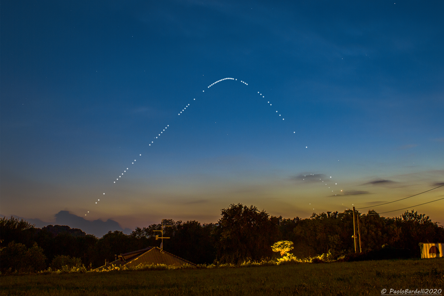 Tutta l’apparizione serale di Venere e Mercurio ripresa dal 7 febbraio al 16 giugno 2020, in una somma di foto scattate tutte le sere (nuvole permettendo) alle ore 21:00 (22:00 ora legale) utilizzando una Canon 400D con un obiettivo da 28 mm. in postazione fissa. Le sequenze sono state poi ridimensionate e sommate ad un’immagine ottenuta con una Canon 6D con lo stesso obiettivo la sera del 21 maggio, in cui i 2 pianeti erano molto vicini. Da notare la grande differenza di luminosità tra i 2 corpi e la maggiore velocità di Mercurio rispetto a Venere. Purtroppo il tempo negli ultimi giorni di ripresa è stato molto inclemente…