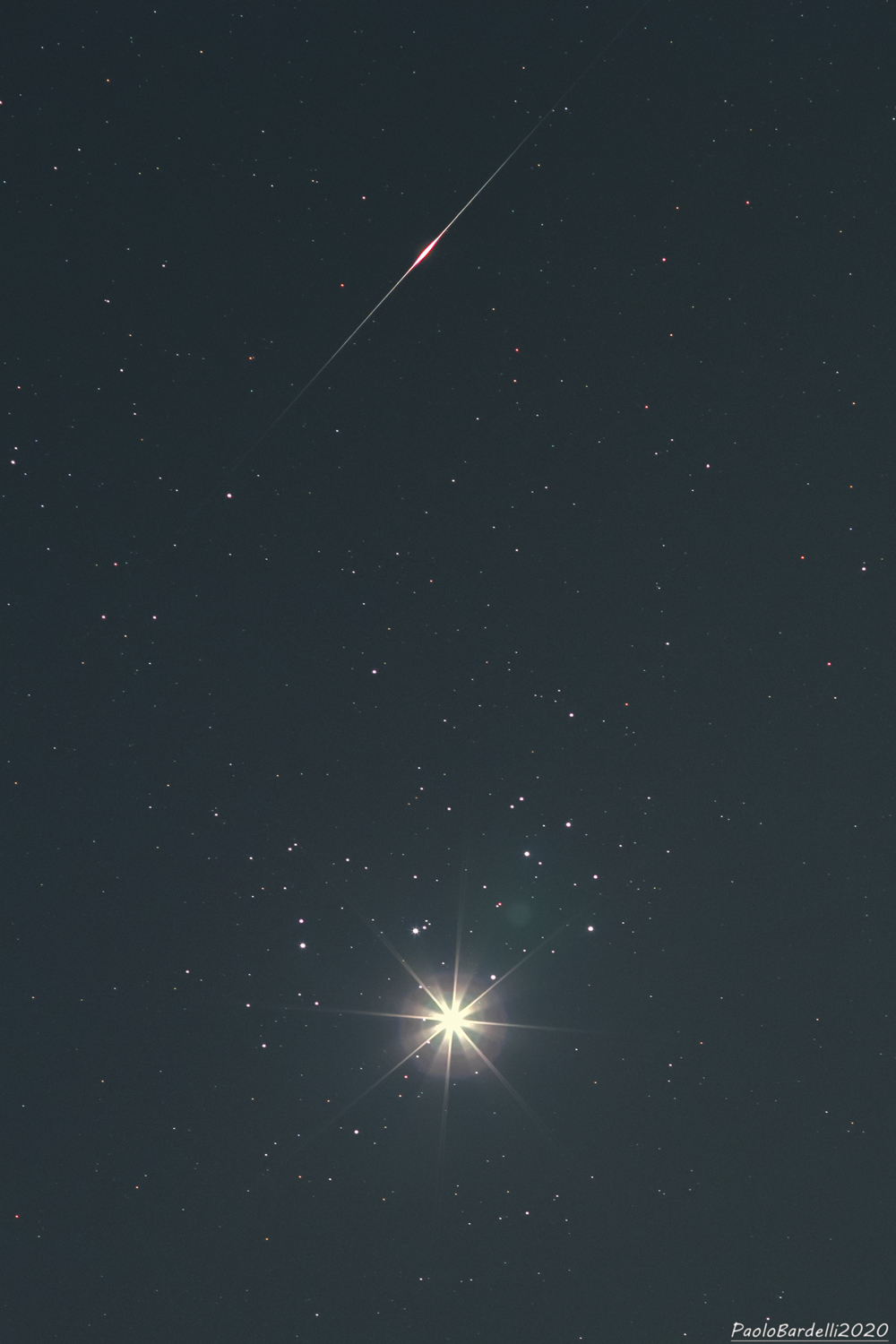 3 aprile, Venere nell’ammasso aperto delle Pleiadi, luminosa come un diamante. Un’immagine imperdibile, impreziosita da un flare inaspettato, che non ho saputo identificare (satellite o rottame spaziale?).
