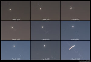 3 aprile, Venere nell’ammasso aperto delle Pleiadi, luminosa come un diamante. Un’immagine imperdibile, impreziosita da un flare inaspettato, che non ho saputo identificare (satellite o rottame spaziale?).