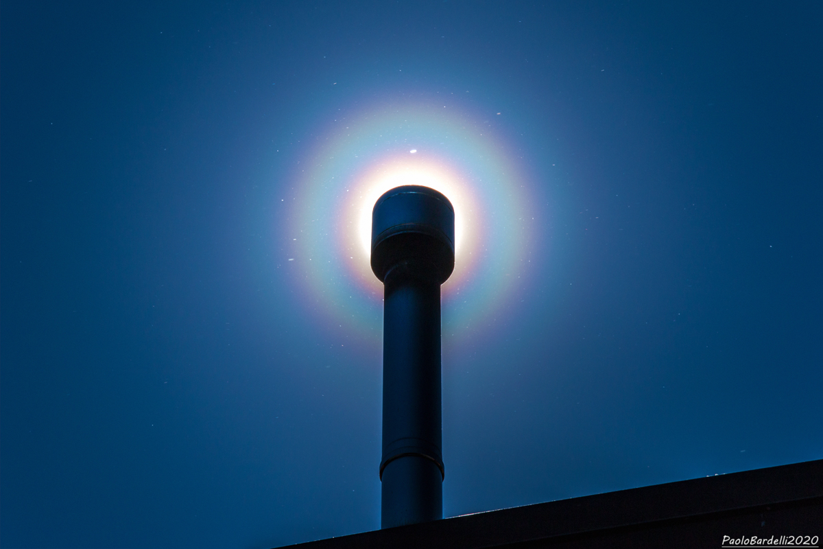 Un raro fenomeno ottico creato dal Sole in condizioni molto particolari. Dopo 2 settimane di tempo caldo e secco, e grazie ad una giornata di vento da nord (foehn), con l’umidità relativa scesa al 10%, l’aria si è saturata di pollini, soprattutto di betulla, nel pieno della fioritura. Questi pollini hanno delle microsfaccettature che riflettono la luce solare fino a creare una vera e propria corona colorata. Quindi può succedere che in un cielo limpido, pulito e senza nubi a volte ci possa essere qualche sorpresa…